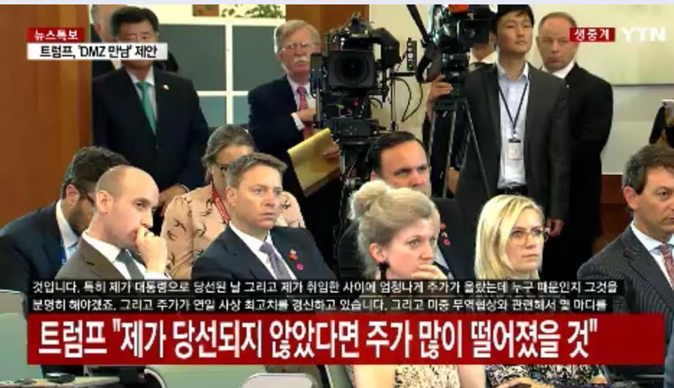 1. 왜 북측 땅을 밟으려고 하십니까? 그리고 김정은 위원장과 악수를 한다고 해서 어떤 변화가 있을 거라고 생각합니까? 왜냐하면 실질적으로 변한 것은 없고 북한이 장거리미사일을 발사했는데 왜 이런 식의 이벤트을 김정은 위원장과 가지시는 것인지 궁금합니다. 일부 비판하는 사람들은 단순히 보여주기식 쇼일 뿐이다. 북한의 핵 보유를 정당화하는 것일 뿐이다, 그렇게 비판하는 사람도 있는데요. 그리고 시진핑 주석과의 회담과 관련해서 이것이 지난 4월의 상황으로 되돌리는 것입니까? 즉 지적재산권을 논의했던 지난 4월의 무역회담이 시작됐던 상황으로 다시 돌아가는 것입니까?