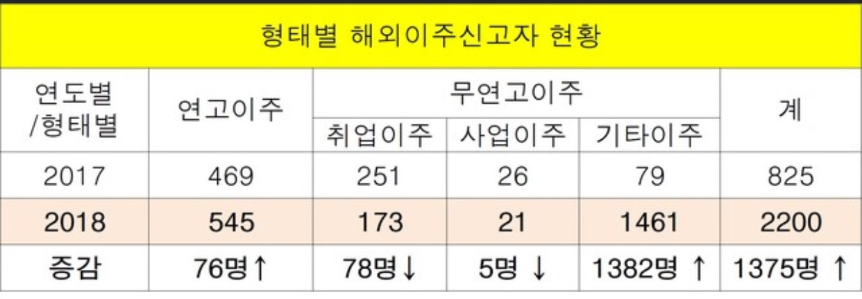 2017, 2018년 당시 영사관에서도 혼선 방지를 위해 개정안을 적극 홍보했죠. 대부분 거주여권으로 신분확인을 하고 우리나라 은행 계좌를 이용했는데, 앞으로는 거주여권으론 신분 확인을 하지 못하니깐 한국에 조금이라도 돈이 있는 이민자들은 서둘러 해외이주 신고를 했습니다. 그래서 2018년 해외 이주자 신고가 급증한 것입니다.