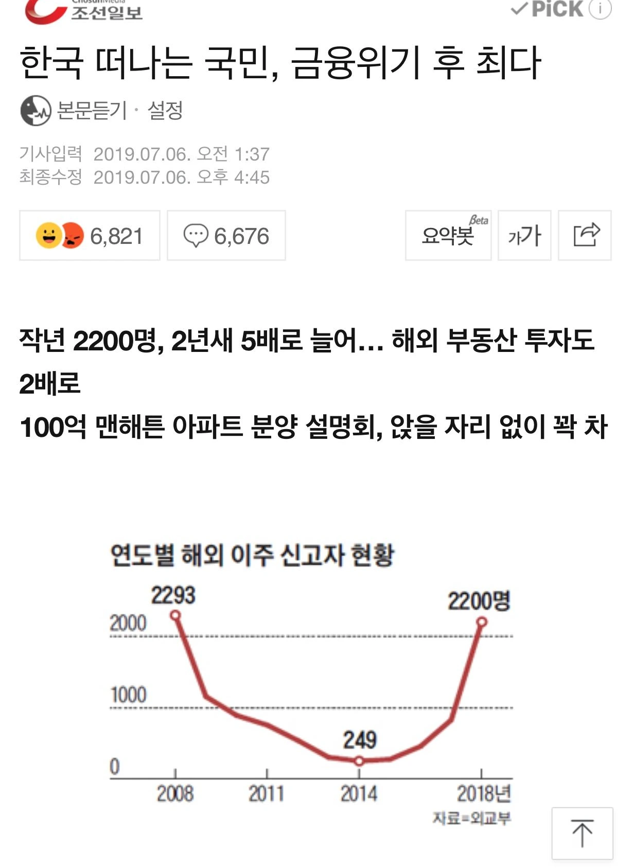 조선일보가 보도한 바에 따르면 해외 이주자 수가 문재인 정권 2년 만에 약 5배나 늘어났다고 합니다. 황교안 자유한국당 대표 역시 이를 인용해 오늘 글을 게시했습니다.