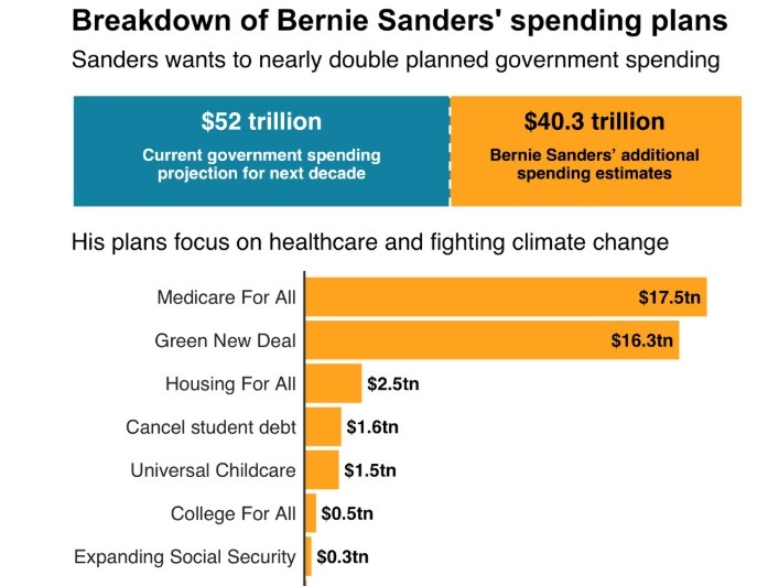 샌더스는 공약 중 의료보험 부문에 가장 많은 예산을 투입한다고 발표했습니다. 전국민을 대상으로 의료보험을 제공하기 위해서는 향후 10년간 17.5조 달러 (약 2경479조원)가 필요하다고 내다봤습니다. 현재 미국 재정상 이를 감당하기는 힘든데요. 샌더스는 이를 기업의 법인세와 부유층의 세금 인상분을 통해 마련한다는 계획입니다.
