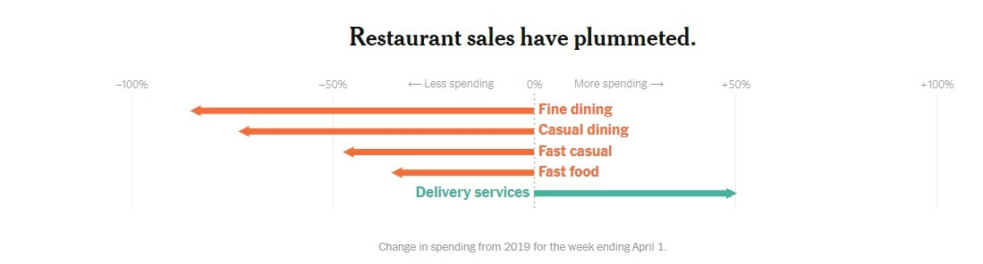 음식점은 파인 다이닝과 캐쥬얼 다이닝 모두 매출이 하락하고 있습니다. 금융위기 등 이전 경제위기 때에는 그마나 음식점은 매출을 어느정도 유지했지만 이번에는 '전염병'과 관련한 위기라서 외식업은 타격이 치명적입니다. 그런데 '배달 서비스'가 50% 가량 늘면서 미국 내에서도 배달만 하는 음식점들이 늘어나고 있습니다.