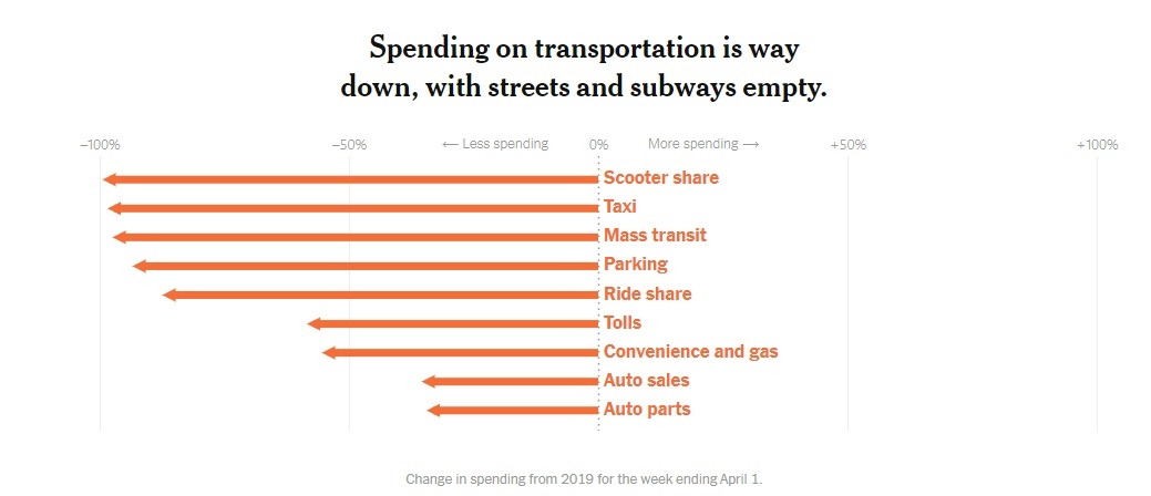 코로나19로 대부분 사람들이 재택근무를 하면서 교통 관련 소비가 급락했습니다. 모든 교통업체들은 매출이 급감했는데요. 섹터별로 보면 스쿠터 공유업체와 택시업체, 그리고 주차장 매출이 90% 이상 떨어졌습니다.