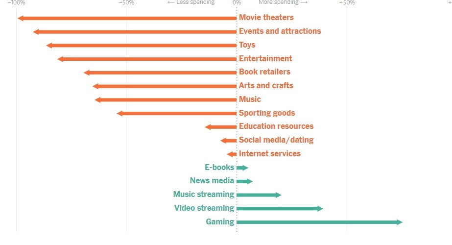 미국의 미디어 관련 소비 패턴도 확 달라졌습니다. 집에서 이용할 수 있는 서비스는 선전하고 있는 반면 외부에서 이용해야 하는 서비스는 악화되고 있습니다.예로 우리나라 비슷하게 영화관들이 문을 닫고 테마파크도 모두 문을 닫았습니다. 콘서트홀과 경기장도 조용합니다.