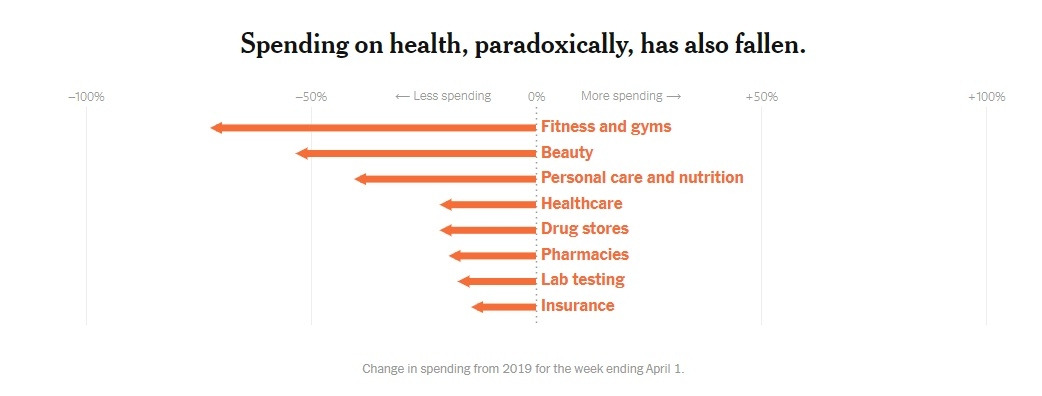 헬스장 이용이 줄어들면서 피트니스 업종이 악화될 것이라는 건 어느정도 예상했지만 약과 관련한 소비도 떨어질지는 예상 못했습니다. NYT는 이 이유가 병원들이 선택적으로 운영시간을 단축하면서 그만큼 환자도 줄어들고 있고 처방전 약도 덜 소비되고 있다고 지적했습니다.
