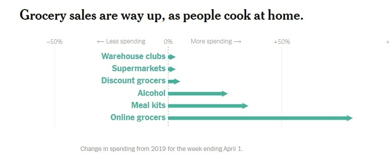 이 통계를 보면 온라인 식료품 유통이 가장 큰 증가세를 보이고 있습니다. NYT에 따르면 3월 18일 기준으로 7일간 온라인 그로서리 세일은 지난해 같은 기간에 비해 79% 늘었습니다. 특히 파스타면, 밀가루, 휴지, 비누가 폭발적인 수요를 보였습니다.