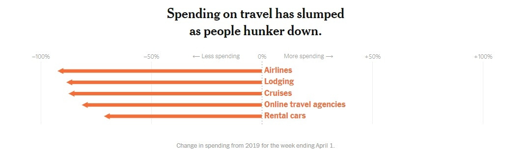 코로나로 가장 위축된 산업은 여행업입니다. 특히 항공사의 매출은 사상 최저입니다. Expedia나 Airbnb 같은 온라인 업체들도 매출이 급락하고 있습니다. 4월1일 기준으로 여행 부문 매출이 지난해 같은 기간에 비해 85% 줄었습니다.