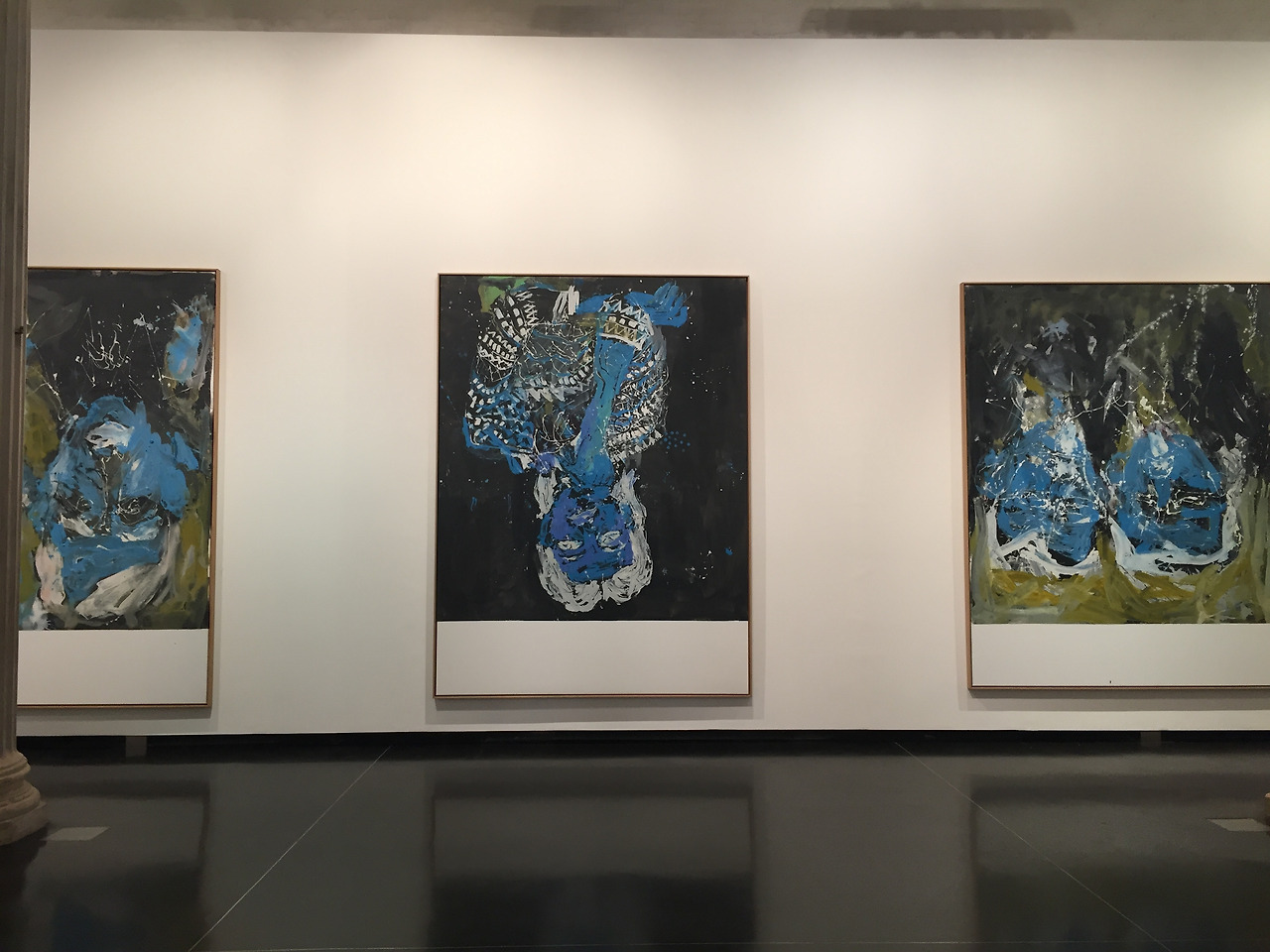 이번 전시는 1960년대 중반의 초기 작업부터 최근의 청 회색조 인물 대작까지 총망라했다. 60년대에 그는 인물들을 바로 그리다가 1969년 ‘머리 위 나무’를 발표하면서 그림을 거꾸로 그리기 시작했다. 똑바로 그리는 것이 무의미해 보였다고 그는 말한다.