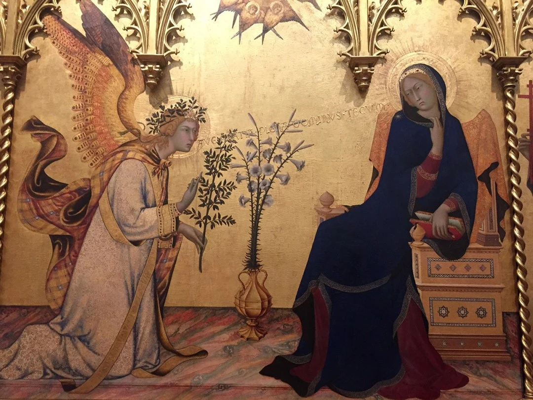 그 다음 시에나 화파의 전시실에서는 시모네 마르티니 Simone Martini의 ‘수태고지’(아래 이미지)가 눈길을 사로잡는다. 시모네 마르티니가 처남 리포 멤미의 도움을 받아 그린 이 작품은 금박의 화려한 패널에 인물과 사물들이 정교하게 묘사돼 화려함과 신비로움을 동시에 보이는 걸작이다. 순결을 상징하는 백합이 화병에 꽂혀 있는 것이 이채롭다. 일반적으로 수태고지 에서는 천사가 백합을 손에 들고 있으며 그것을 마리아에게 전달하는 장면을 그리고 있다.