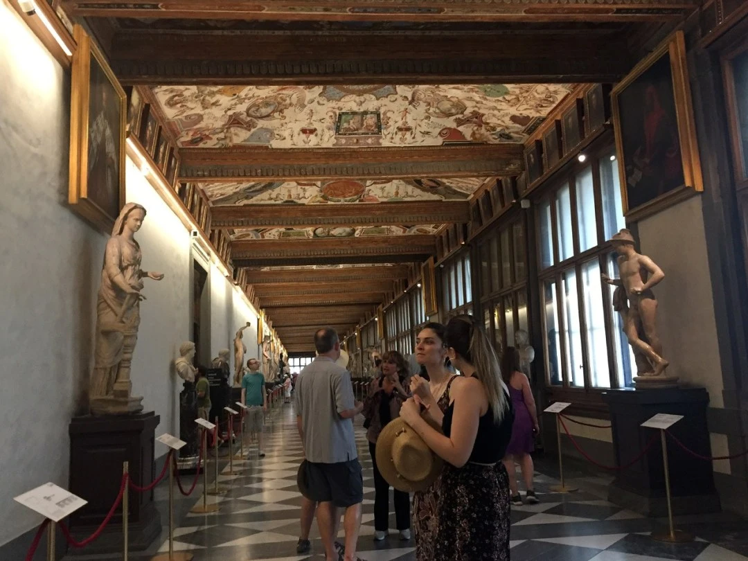 우피치 (Uffici)는 집무실(Office)을 뜻한다. 토스카나 대공 코시모 1세(1519~1574)가 행정과 사법 업무를 담당하고 메디치 가문의 예술품을 전시할 공간으로 사용하기 위해 지어졌다. 가문의 전속 화가이자 건축을 담당했던 조르조 바사리 Giorgio Vasari 가 설계를 맡아 1560년 착공한 건물은 코시모의 아들 프란체스코 1세 때인 1581년 완공됐다. 메디치 가문의 궁전인 피티궁에서 바사리 통로를 통해 오갈 수 있도록 설계된 건물은 긴 복도를 가진 두 개의 건물로 지어졌다가 후에 두 건물을 연결하는 다리를 놓아 현재의 ㄷ자형으로 만들어졌다. 지나 코시모 1세는 우피치 1층에 자신의 집무실 공간을 마련하면서 2층엔 당대의 위대한 예술가들이 작업할 공간을 마련했고 3층에는 메디치가가 소장하고 있던 작품들을 전시했다. 프란체스코 1세는 베키오궁과 메디치가의 옛 저택에 있던 예술품들을 우피치로 옮겨 왔다.