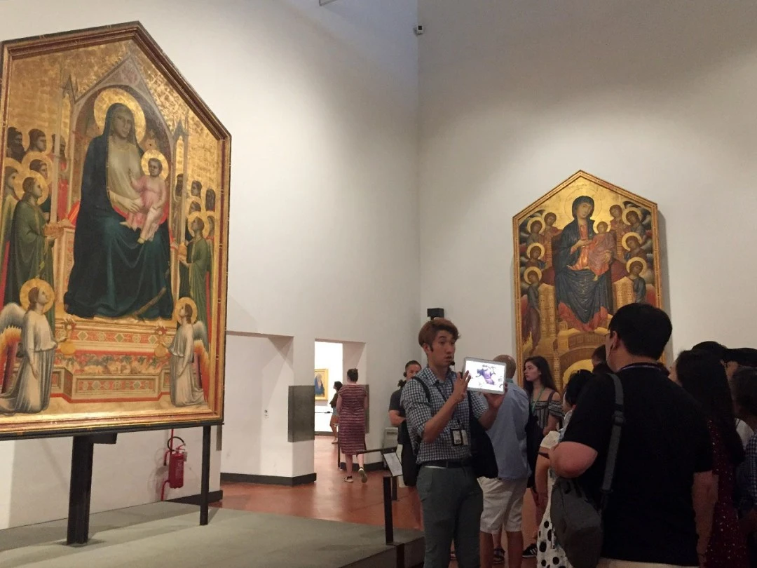 미술관의 핵심은 45개의 전시실이 있는 3층이다. 미술사적으로 자주 언급되는 르네상스의 회화 작품들을 시대순으로 보도록 동선을 짜 놓았다. 전시 도입부는 중세의 끝자락에 있는 치마부에 Cimabue와 시에나화파의 두치오 Duccio, 르네상스의 시작을 알린 조토 Giotto 가 그린 성모자상(위 이미지)이 있다. 앞의 두 작품에 비교해 조토의 성모와 아기예수의 모습은 훨씬 인간에 가깝다. 상상하는 신이 아니라 인간의 형상을 재현한 것이 확연하다.