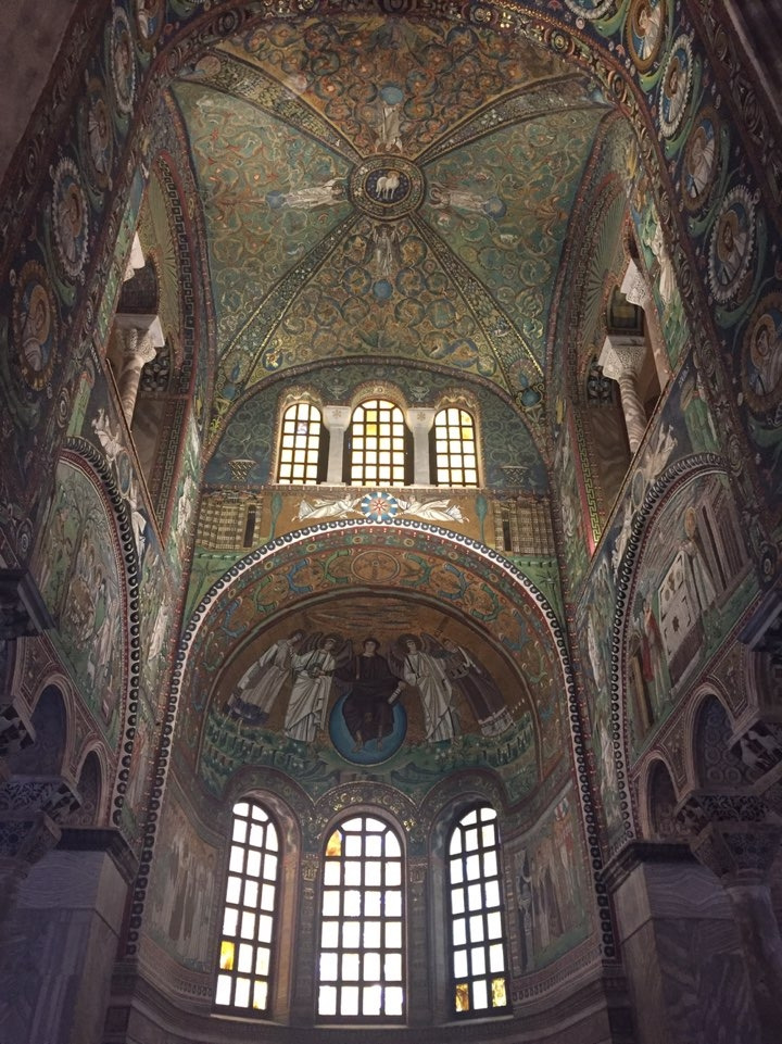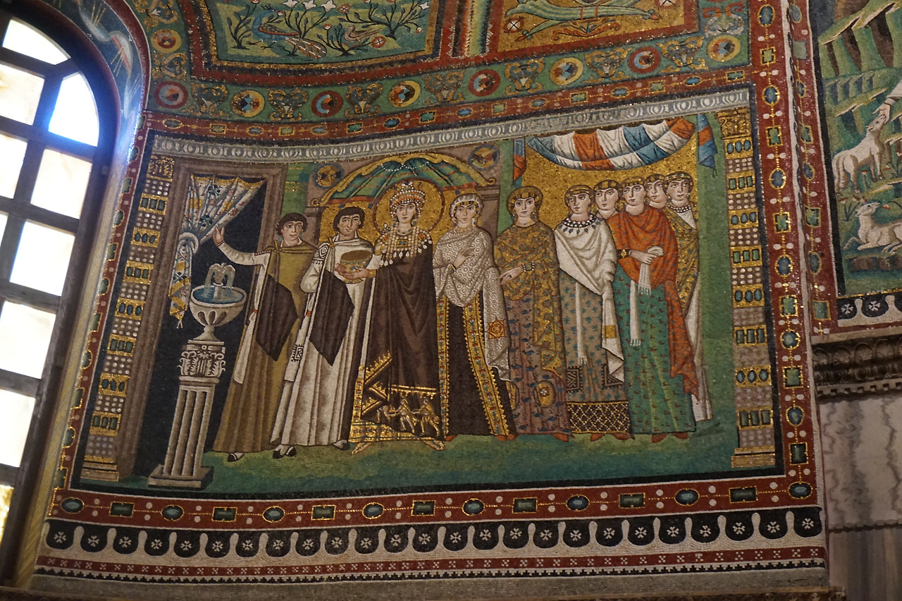 모자이크란 다양한 색깔의 돌이나 도자기, 유리, 타일, 조개껍데기 등으로 만든 작은 조각을 눌어 붙여 만드는 그림이다. 조각들이 작을수록 더욱 사실적으로 표현할 수 있다. 무수한 조각을 끼워 맞추는 데는 엄청난 시간과 노력이 필요하지만 변색이 적고 내구성이 뛰어나다. 장식적인 것과 실용적인 면을 두루 갖춰 건물의 벽, 바닥 장식에 널리 사용됐다. 모자이크는 비잔티움 시대에 전성기를 이뤘다. 다양한 소재의 유리와 금박을 모자이크에 넣어 모자이크는 더욱 화려해졌다. 모자이크 조각의 각도에 변화를 주어 영롱한 빛을 반사하도록 하면서 그리스도교 전례를 위한 영적인 공간에 화려하고 섬세한 모자이크화가 설치됐다. 동로마 제국에 소피아 성당이 세워질 무렵 서로마제국의 수도 라벤나에는 산 비탈레가 세워졌다.