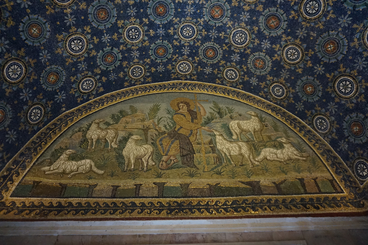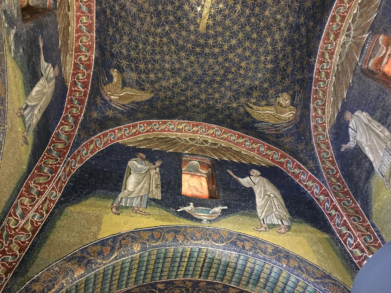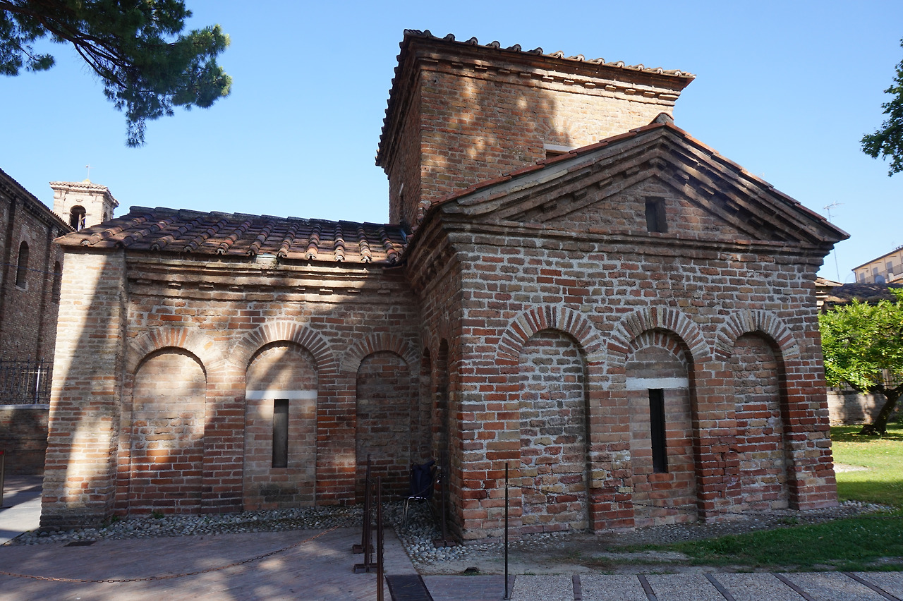 너무 아름다워서 그대로 떠나기 아까울 정도였던 성당을 뒤로하고 밖으로 나왔다. 뒤로 약 50m 거리에 자그마한 벽돌 건물이 보인다. 유명한 갈라 플라치디아의 무덤이다. 산 비탈레보다 수십 년 앞서 지어진 무덤형 교회다. 초기 기독교 건축물의 대표적 사례로 꼽히는 이곳은 십자가형 평면을 이루며 네 팔 부분을 배럴 볼트( 2차원 아치를 3차원 터널식으로 구성한 구조방식)로 마감했다. 볼트 구조로만들어진 네 개의 팔 부분 천정과 겹치는 부분의 돔 천정은 모두 단순하지만 순수하게 아름다운 모자이크로 장식되어 있다.