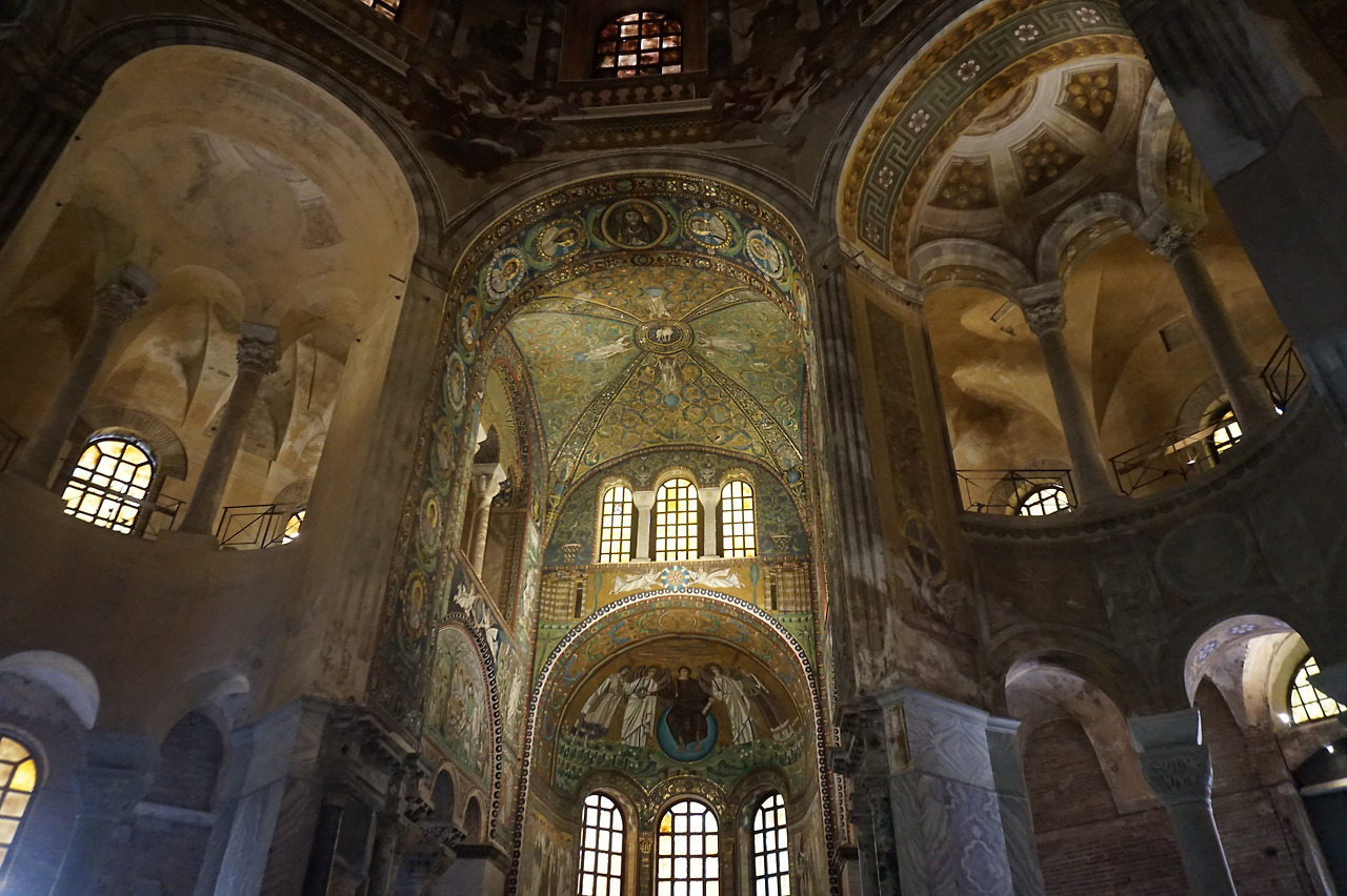 십자형으로 4등분 된 둥근 천장은 빈틈없이 잎과 과일, 꽃 등이 모자이크로 화려하게 장식되어 있고 ‘하느님의 어린양’으로 묘사된 예수가 그 정점을 이루고 있다. 예수를 사방에서 네 명의 천사가 호위하고 있다. 높이 난 3개의 채광창에서 들어오는 빛이 모자이크를 비추며 환상적인 장면을 연출했다. 채광창 아래로 자주색 옷을 입은 예수가 우주를 상징하는 파란색 구에 앉아있고 그 옆으로 성당을 봉헌하는 주교와 이 성당의 기초가 되는 비탈리 성인이 자리 잡고 있다. 양 측면으로 유명한 모자이크 패널이 있다. 왼쪽에는 궁정 관리와 막시미아누스 주교, 근위병과 부제를 거느린 유스티니아누스 황제의 모습이 담겨있다. 유스티니아누스 황제의 머리에는 성인처럼 후광이 그려져 있고 손에는 황금으로 된 성반을 들고 있다. 유스티니아누스 왼쪽의 병사와 오른쪽의 성직자는 그가 속계와 종교계 모두의 지도자임을 상징한다. 인물들은 V자형으로 배치되어 있으며 유스티니아누스가 맨 앞 가운데, 그 왼쪽에 막시밀리아누스 주교, 그리고 나머지 사람들을 그들 뒤로 배치해 놓았다.