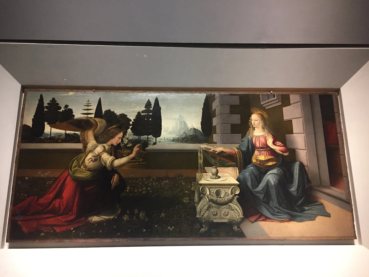 <수태고지>는 1867년 우피치에 소장되기 전에 몬테 올리베토 수도원에 걸려있었고 도메니코 기를란다요의 작품으로 알고 있었다. 일부 평론가들은 레오나르도 다빈치의 스승인 베로키오의 작품이라고 했지만 존 러스킨은 레오나르도의 초기작품이라고 주장했다. 모든 의문은 1907년 풀렸다. 천사 가브리엘의 소매를 그리기 위한 레오나르도 다빈치의 습작이 등장하면서 사람들은 <수태고지>가 레오나르도가 20대에 접어든 1470~3년 경 그린 것이라고 믿게 되었다.