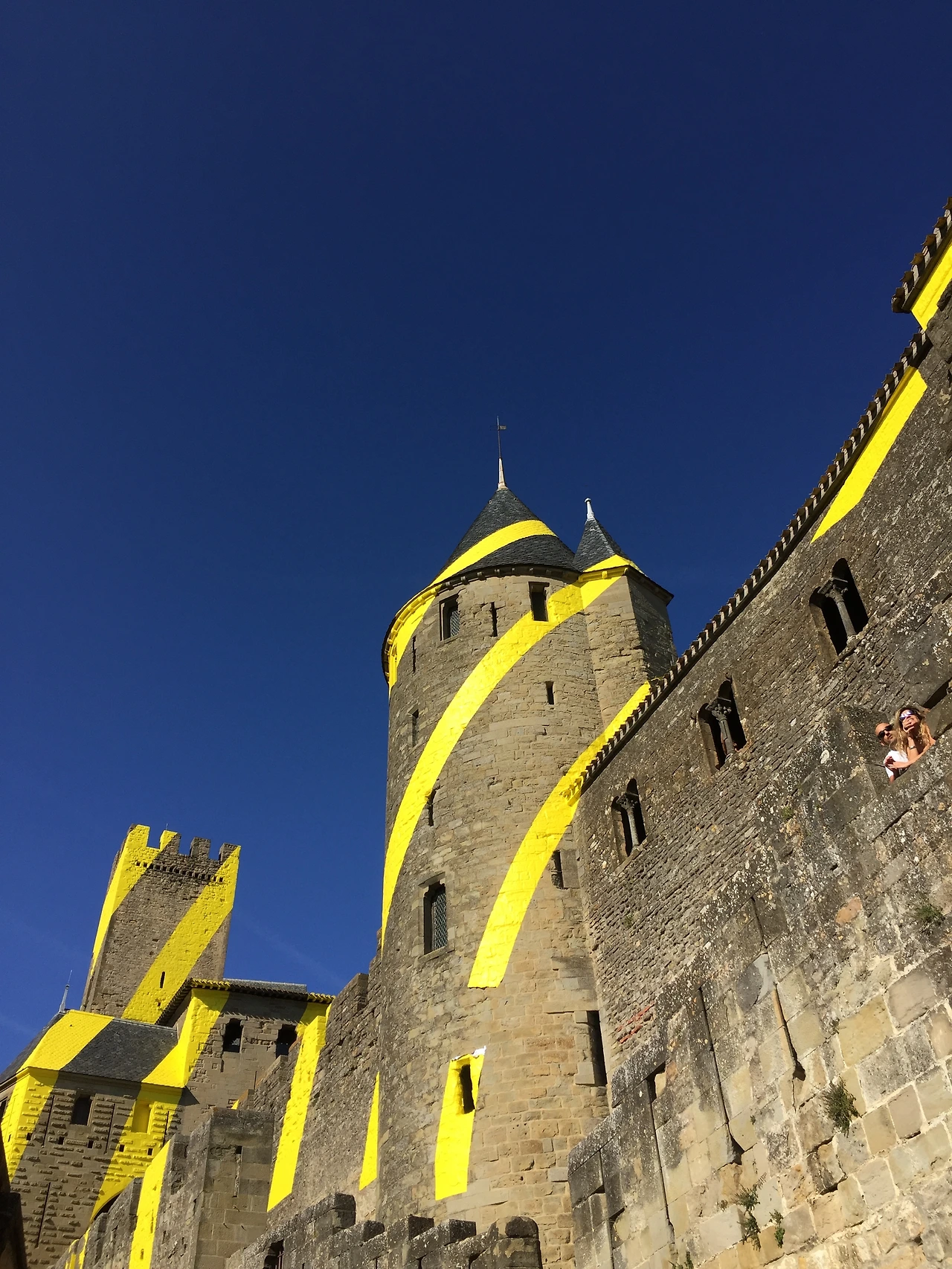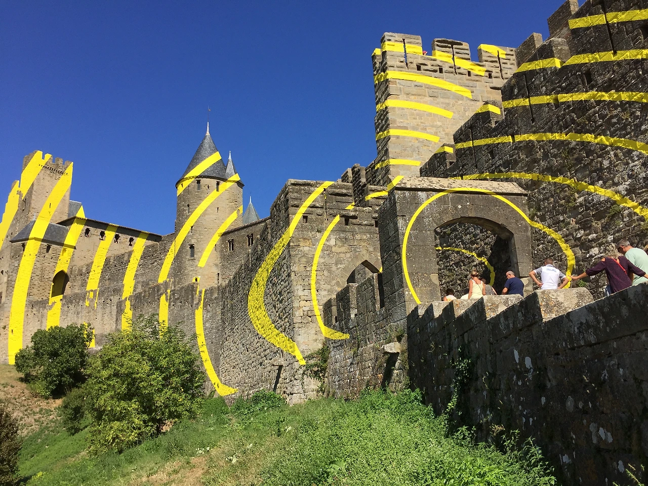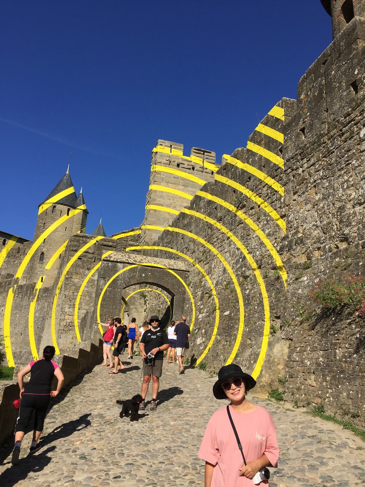 갈로-로만 시대에 설립된 성채는 52개의 탑과 이중으로 들어선 3㎞ 길이의 성벽으로 유명합니다. 그 성벽에 야광 페인트로 둥근 원들이 그려져 있었습니다. 나르본 퐁푸르아 수도원 편에서 잠시 언급했는데 방문객들이 많은 여름 시즌 6월부터 9월까지 남부 옥시타니 지방에서 역사적 건물이나 문화유적 12곳에 유명한 현대미술 작가들을 초대해 현대 미술작품을 설치하는 IN SITU 프로젝트가 있었는데 카르카손에서도 있었던 겁니다. 워낙 눈에 띄어서 멀리 보이는 높은 언덕 위에 성채를 더욱 멋지게 만들었습니다. 특히나 카르카손 성채는 유네스코 세계 문화유산 지정 20주년을 기념하는 것이라 더욱 의미가 있었던 작품입니다. 이탈리아 작가 펠리체 바리니의 작품 ' Cercles concentriques excentriques '입니다. 동심원, 편심원 정도로 뜻을 이해하면 되겠네요.