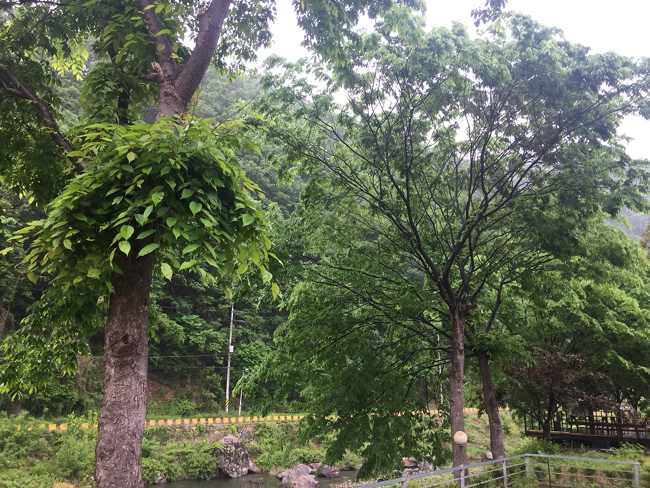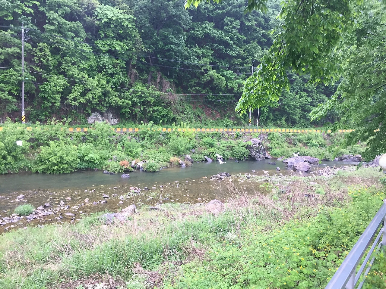 아침에 일어나 문을 여니 비가 내리고 있습니다. 냇가의 빗소리 참 듣기 좋아요. (‘슬기로운 의사생활’에 등장하는 채송화 선생 취향이 딱 내 취향이던데. 비 구경 좋아하고 , 캠핑 좋아하고 , 귀여운 우주도 예뻐하고..)