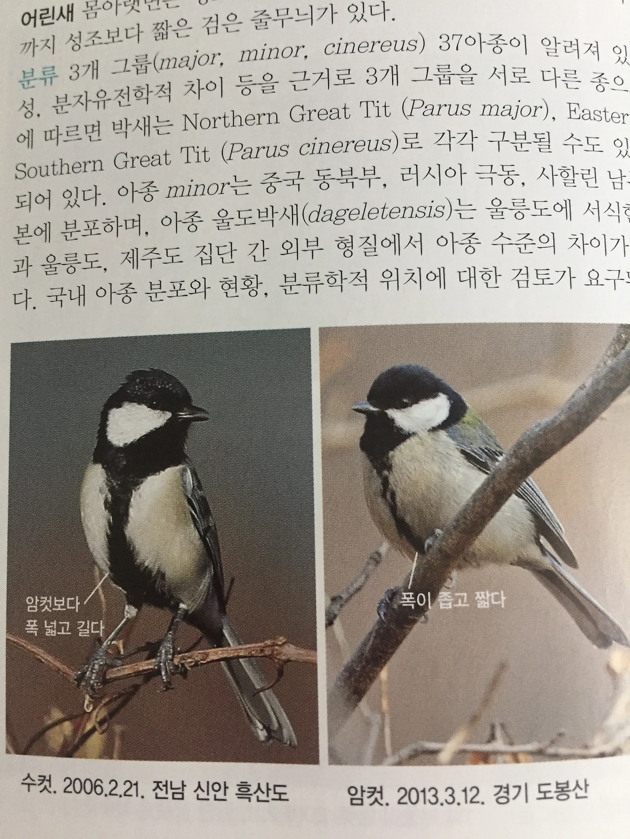 ‘ 매우 다양한 환경에서 서식한다. 나무 위와 땅에서 곤충, 거미류, 식물의 종자와 열매를 먹는다. 수컷은 몸 윗면이 청회색이며 윗등은 녹황색이다. 머리에서 귀깃을 돌아 턱밑, 멱까지 검은색이다. 몸 아랫면은 흰색이다. 턱 밑에서 아래 꼬리 덮깃까지 검은 줄무늬가 있다. 암컷은 수컷보다 약간 작다. 배의 검은 줄무늬가 수컷보다 조금 좁다. ‘ (야생조류 필드가이드, 박종길 글과 사진, 자연과 생태 )