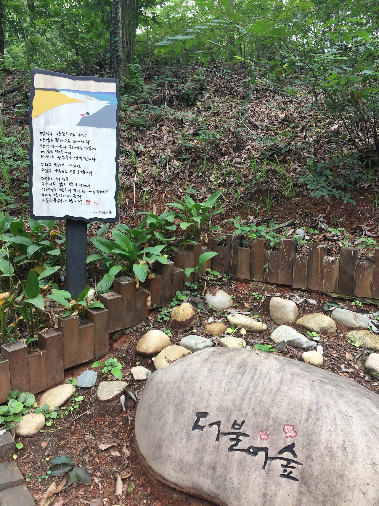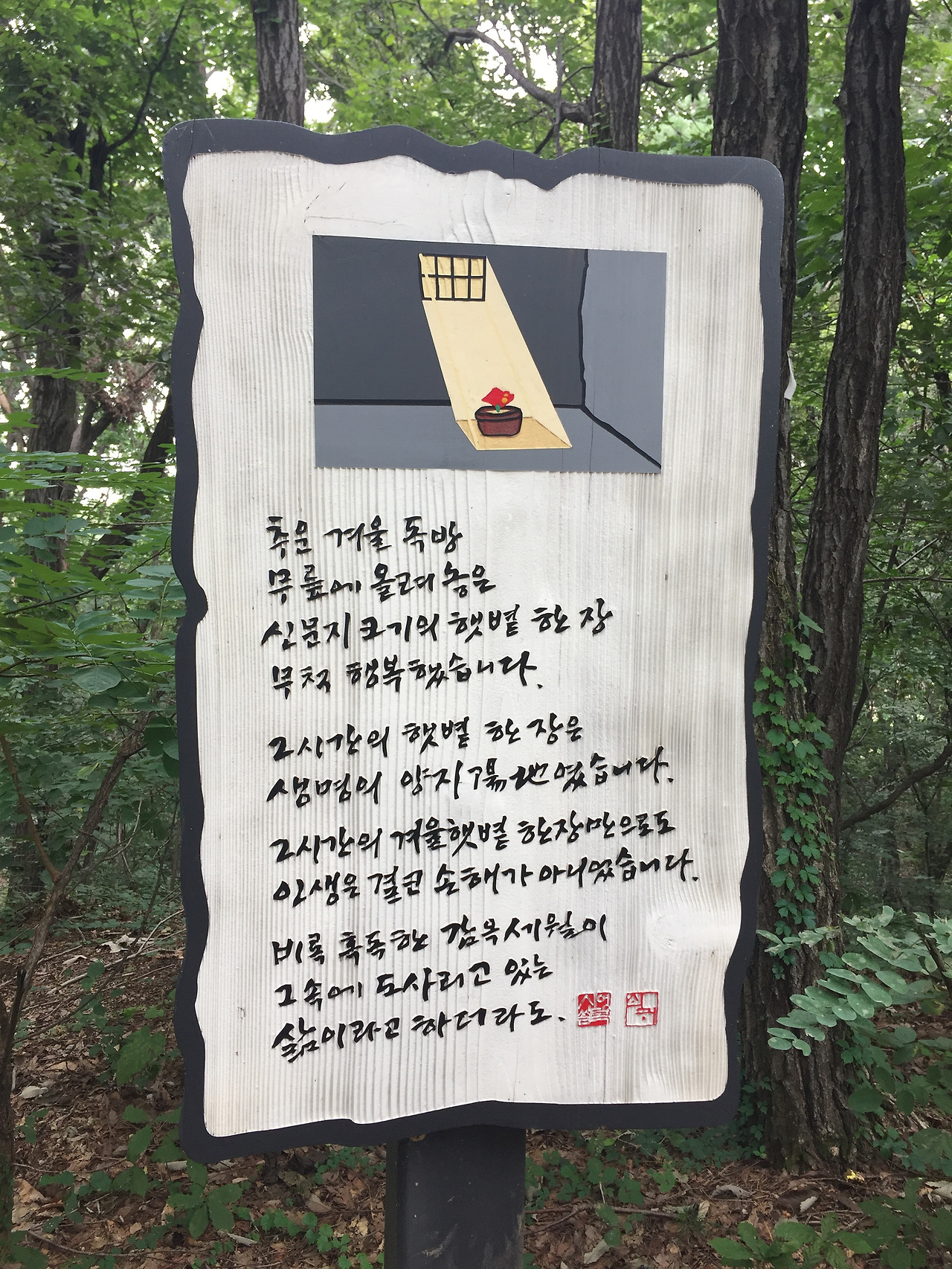 그는 한국인의 정서를 표현할 수 있는 민중의 글씨체를 모색하던 중 어머니의 필체에서 영향을 받아 어깨동무체라고도 불리는 ‘신영복체’를 만들어 적지 않은 작품을 남겼다. 더불어 숲 산책로에는 선생이 남긴 글을 담은 시화 팻말 36개가 세워져 있어 사색하며 걷기에 아주 좋다.