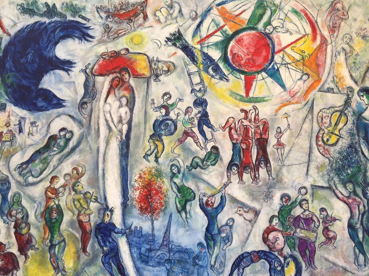 샤갈은 1887년 7월 7일 러시아 서부 벨라루스 공화국의 비테프스크(유대인 거주지역)에서 태어났다. 비교적 유복한 어린 시절을 보낸 샤갈은 생트페테르부르크에서 미술수업을 받다가 후원자의 재정지원으로 파리에 가게 된다. 모이셰 세갈이라는 이름도 프랑스식 마르크 샤갈로 바꾸고 모딜리아니 등 다른 나라에서 온 화가들과 교감하며 열정적으로 그림을 그렸다. 1차 대전 중인 1914년 고향 비테프스크로 돌아간 샤갈은 이듬해인 1915년 벨라 로젠펠드와 결혼했다. 보석 세공사의 딸 벨라는 미모와 교양을 갖춘 여인이었다. 샤갈은 비테프스크의 인민 미술위원으로 미술학교 교장을 맡아 일하다 곧 그만두고 모스크바로 옮겨 무대미술에 열중했다. 모스크바 국립 유대 극장의 벽화 장식을 의뢰받아 작업하던 중 사회주의자들과 마찰로 1922년 가족과 함께 영구히 러시아를 떠났다. 베를린에서 파리로 옮겨 다니며 힘들게 생활했지만 판화 연작 등을 발표하며 국제적 명성을 쌓았고 1926년 뉴욕에서도 개인전을 가졌다. 유대인인 샤갈은 2차 대전이 발발하자 가족과 함께 뉴욕으로 도피해 유럽서 피신해 온 다른 예술가들과 어울려 예술 활동을 이어나갔다. 그러던 중 1944년 사랑하는 아내이자 뮤즈인 벨라가 감염으로 갑자기 세상을 떠났다. 큰 상실감에 빠져 9개월 간 붓을 들지 못하다가 딸의 소개로 버지니아 해거드를 만나 슬럼프를 극복하게 된다. 1948년 프랑스로 돌아와 오르쥬발에 살면서 유럽의 도시에서 전시회를 이어갔다. 1952년 발렌티나(바바) 브로드스키와 결혼하면서 예술적으로도 새로운 활력을 받아 성경 시리즈 작업과 파리 오페라 천정화 등을 제작했다. 1977년 프랑스 정부로부터 문화훈장을 받았고 생애 마지막 20년 간 생폴 드 방스에서 살다가 1985년 97세의 나이로 삶을 마감했다. 긴 세월을 예술가로 살면서 아름다운 색채와 초현실적인 이미지로 우리들에게 꿈과 환상을 심어준 그는 생폴 드 방스의 언덕 아래 유대인 묘지에 생의 후반을 함께한 바바와 함께 조용히 묻혀 있었다. 그의 예술작품은 영원히 남아 우리들에게 사랑과 평화의 메시지를 전하고 있다.