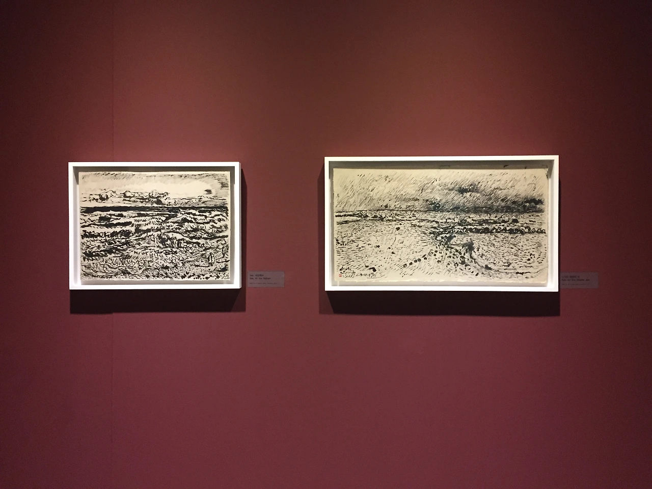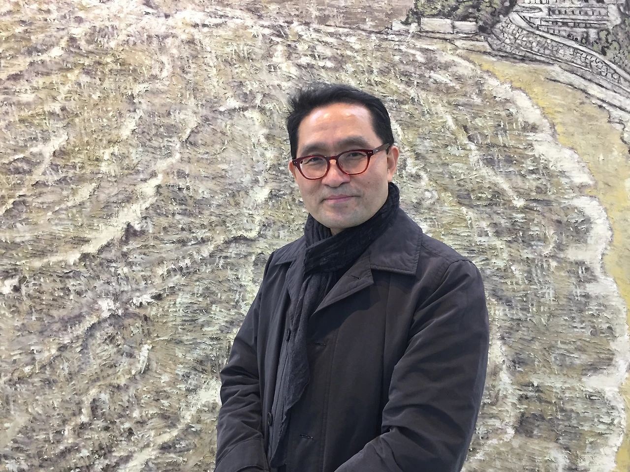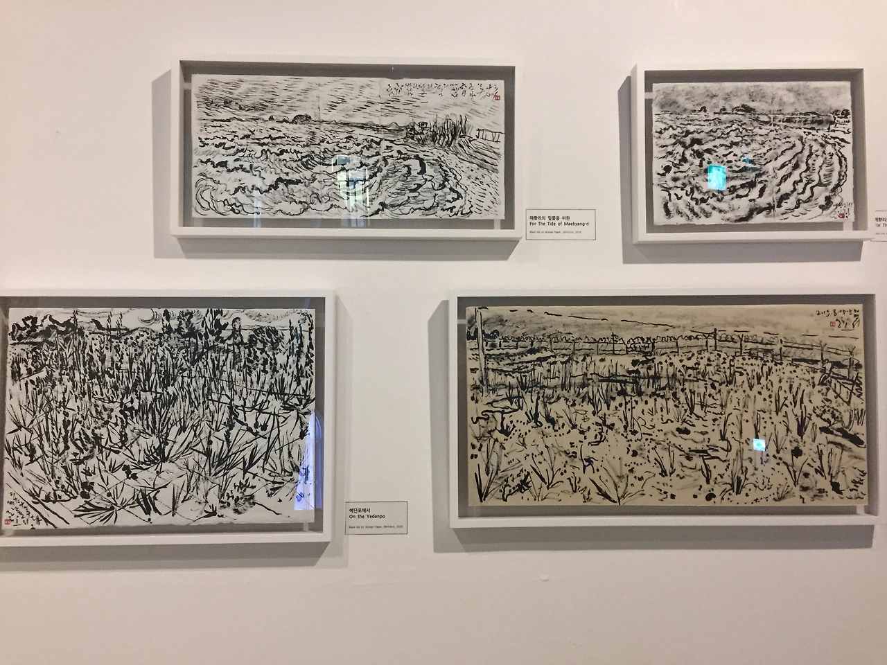 작가는 4년 전 전시에서 선보였던 물성을 극대화했던 작업방식에서 더 나아가 다양한 실험을 통해 작품에 섬세한 디테일을 더하는 방법을 모색했다. 현장에서 먹과 붓으로 빠르게 드로잉 한 풍경을 기초 삼아 드넓은 캔버스에 시간을 겹겹이 쌓아가는 방식이다.