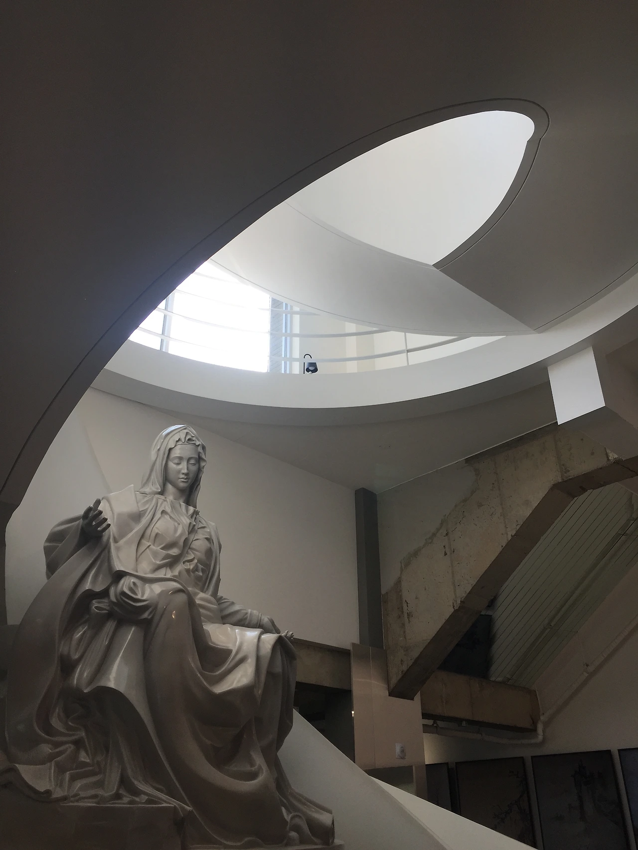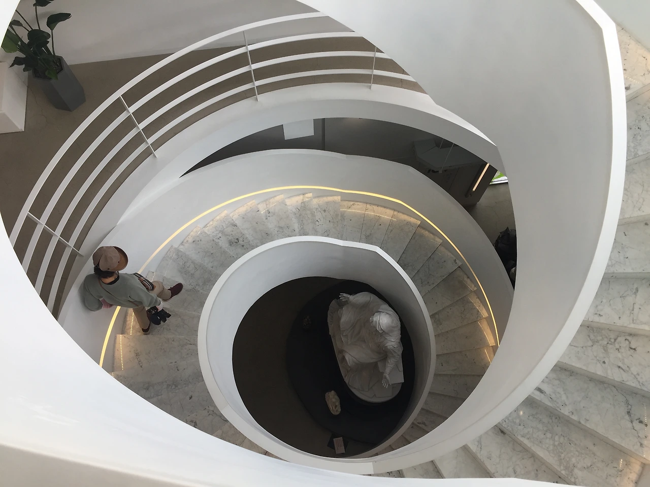 하늘에서 쏟아지는 자연광이 공간 전체에 퍼지고 피에타의 성모상 얼굴에 부드러운 그림자를 드리운다. 설계 초기부터 이이남 작가의 작품에 맞춰 계획된 나선 계단 공간은 건축과 조각의 협업인 셈이다. 미켈란젤로의 피에타를 차용해 만든 이이남 작가의 작품으로 아래층에는 성모상이, 2층에는 성모의 품을 떠난 예수가 걸려있어 밤에 조명을 받으면 공중에 예수가 떠있는 것처럼 보인다. 나선형 계단은 원형 동선을 따라 움직이면 내부와 외부, 근경과 원경 등을 번갈아 인식할 수 있는 건축적 산책로로서 작동한다.