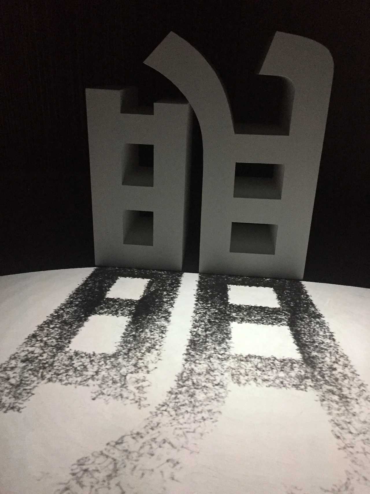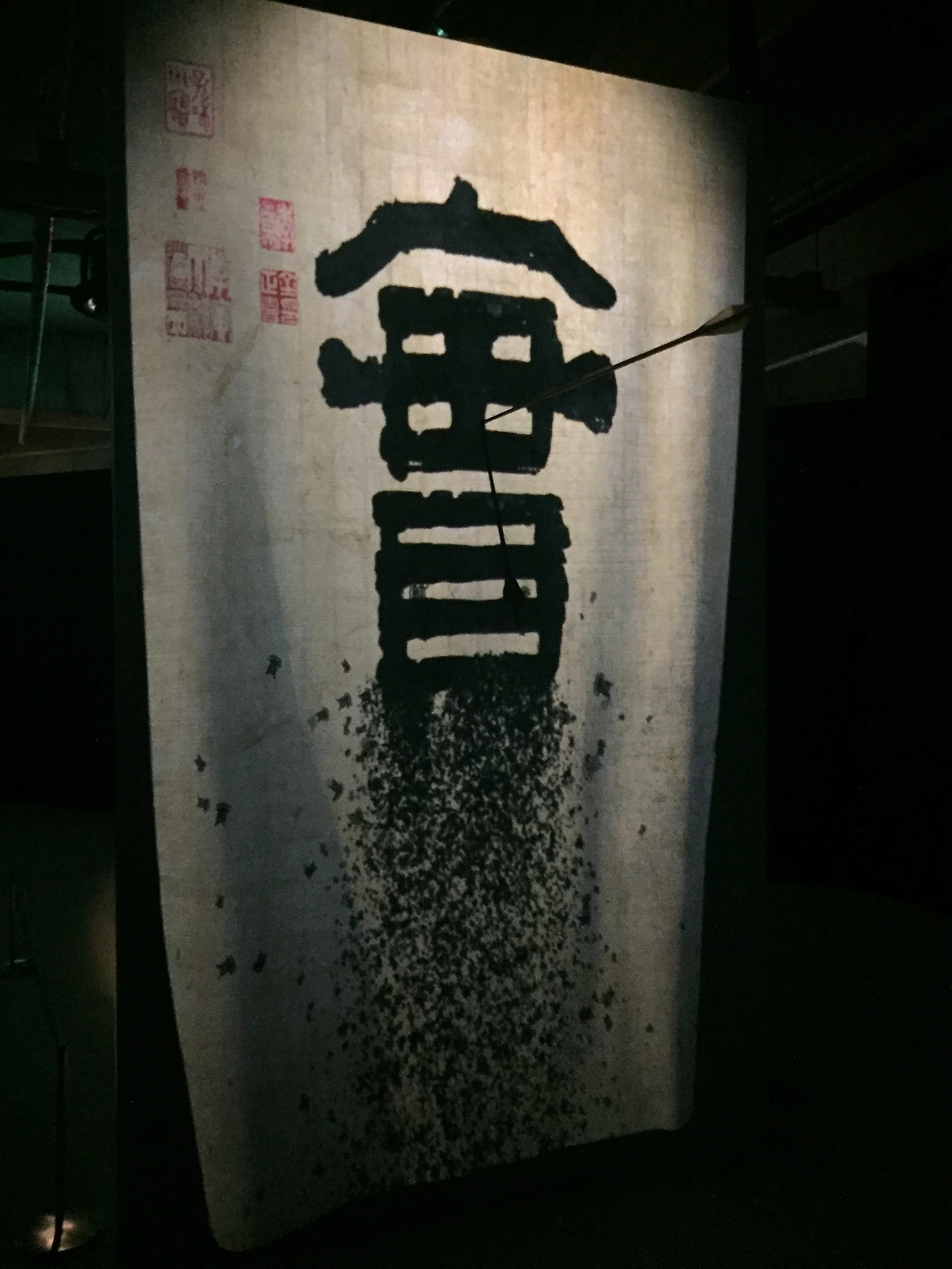 작품 '분열하는 인류'는 벽 하나를 두고 서로 다른 화살을 마주하고 있다. 한쪽에선 열매 '실'자가 끊임없이 가루가 되어 흩어진다. 뒷면으로 돌아가면 거울에 꽂힌 화살이 나(관객)를 향한다. 아니, 내가 쏜 화살인가? 구분이 안 되는 모호한 상황에 직면한다.