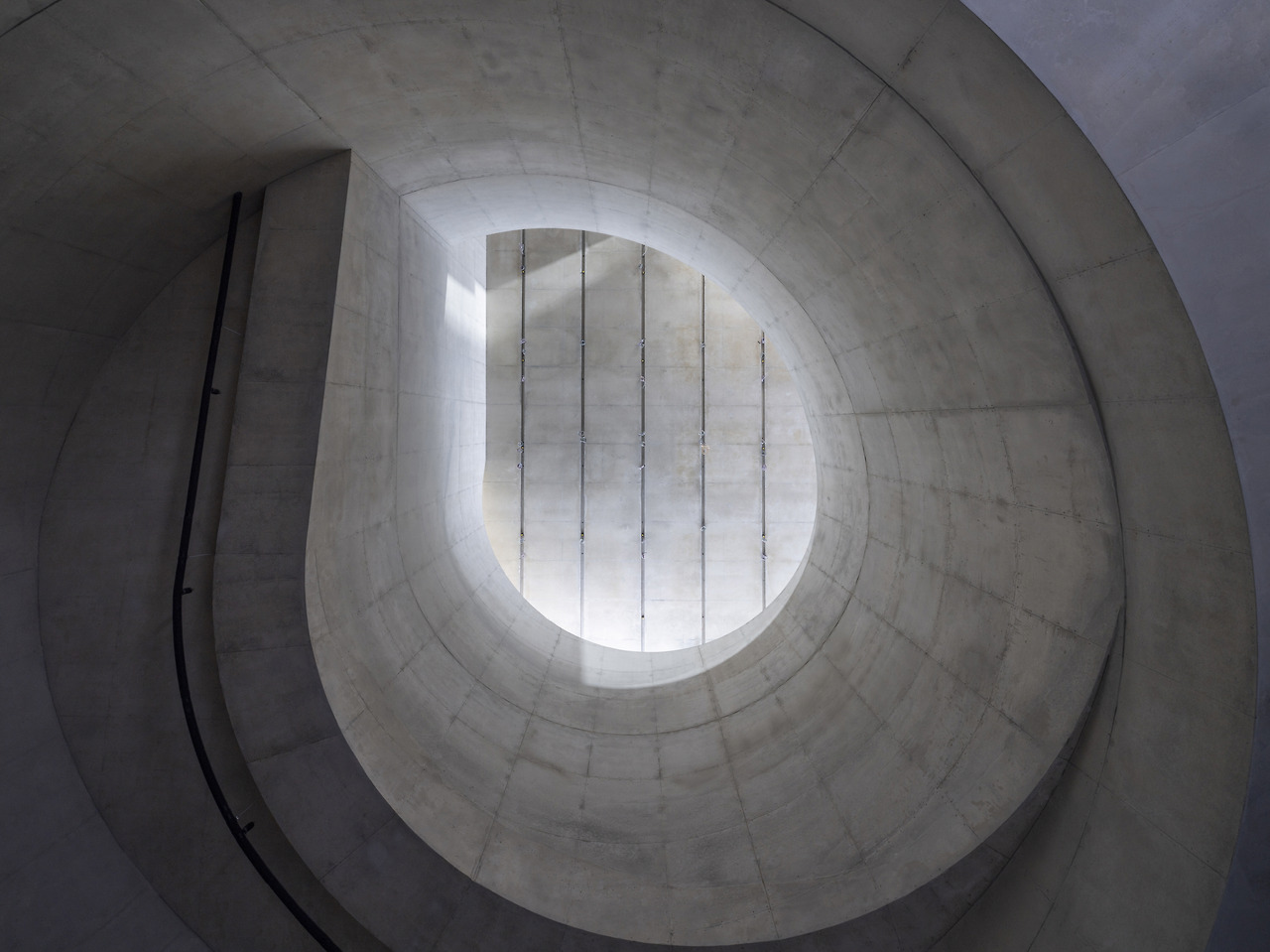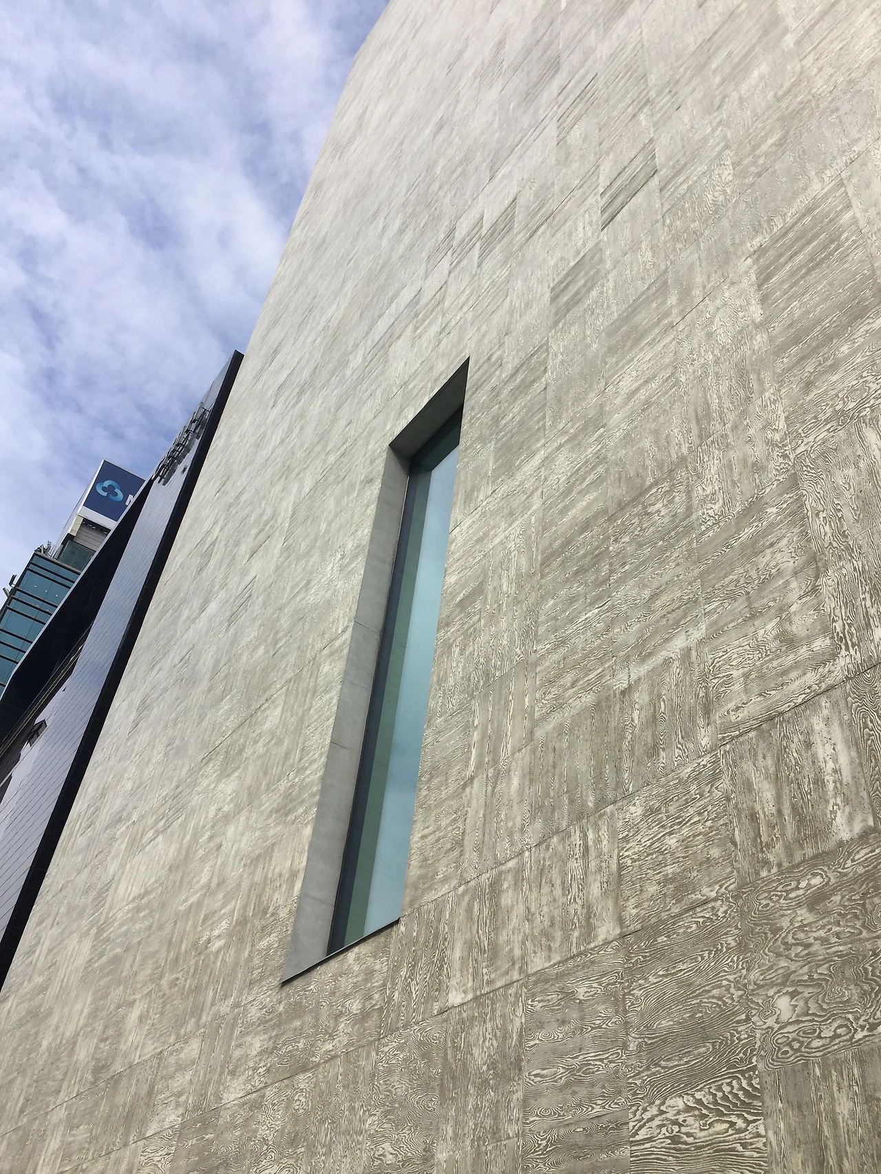 파사드의 높은 콘크리트 벽은 나무판 거푸집을 사용해 양생 했다. 시간과 공은 많이 들었지만 소나무의 질감을 그대로 살려 시각적·촉각적 경험을 선사한다. 날카롭고 기하학적이며 미니멀한 일체형 구조의 건물과 나뭇결 무늬는 뚜렷하게 대비되는 것 같으면서도 자연스럽게 조화를 이룬다. 목판 거푸집마다 문양과 결이 달라서 마치 회화 작품을 보는 것 같다.