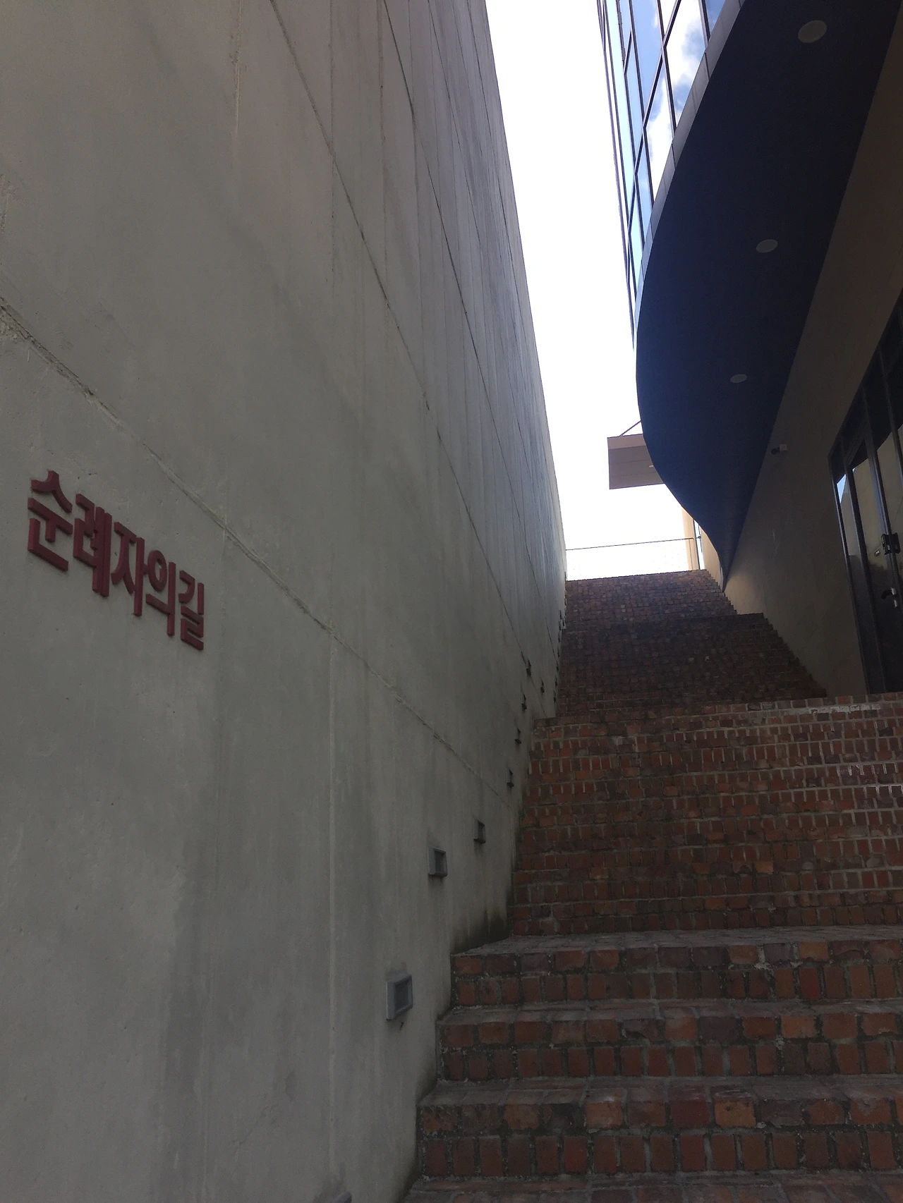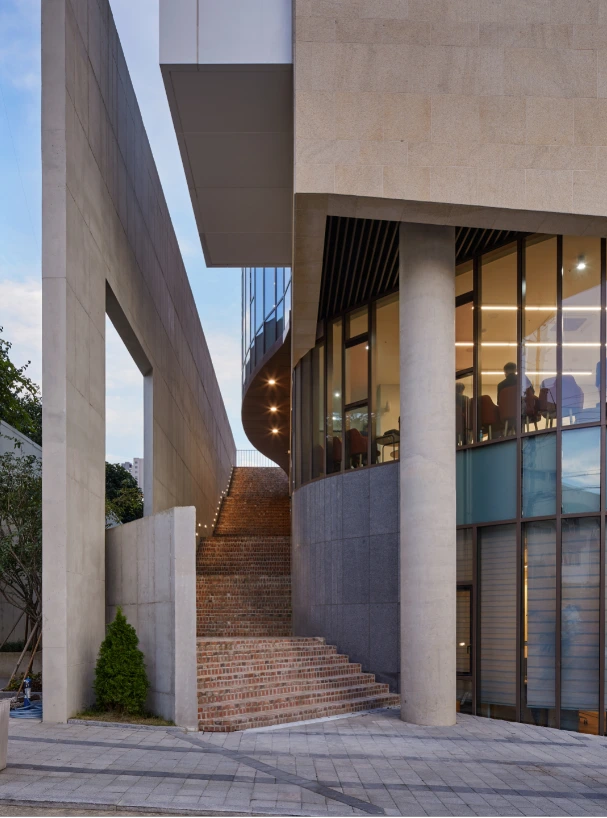 내부를 관통하는 1층 로비를 통해 교회 정문으로 나가면 후면도로로 연결된다. 정문 옆으로 건물을 따라 오르는 계단은 붉은 벽돌로 되어 있다. 이전 벽돌 교회당의 외장재를 바닥 마감재로 재활용한 것이다. ‘순례자의 길’이라 이름 지어진 벽돌 계단을 따라 올라가면 1층에서 3층 대예배당으로 직접 들어갈 수 있다. 이 교수는 “이전 교회의 흔적을 밟으며 교회의 역사를 회상하고 주변 주거지와 시선이 차단된 좁은 길을 감아 돌면서 순례자의 마음과 가까워지도록 공간을 만들었다”라고 말했다.