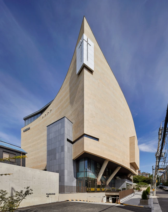 남측 면과 서측 면이 만나는 모서리 부분에 외벽을 덧대 십자가 모양을 만들었다. 십자가를 따로 세우지 않고 건축물에 녹아들게 하는 디자인은 대전 목양교회(1999)에서 처음 시도했다.