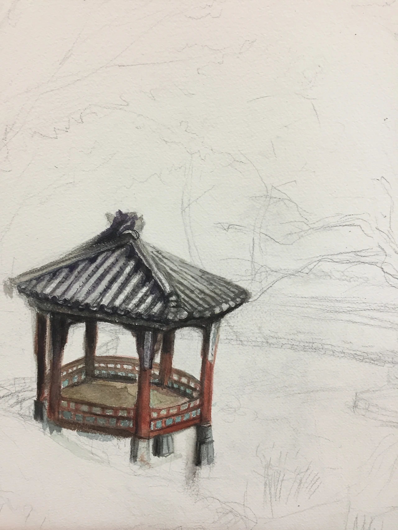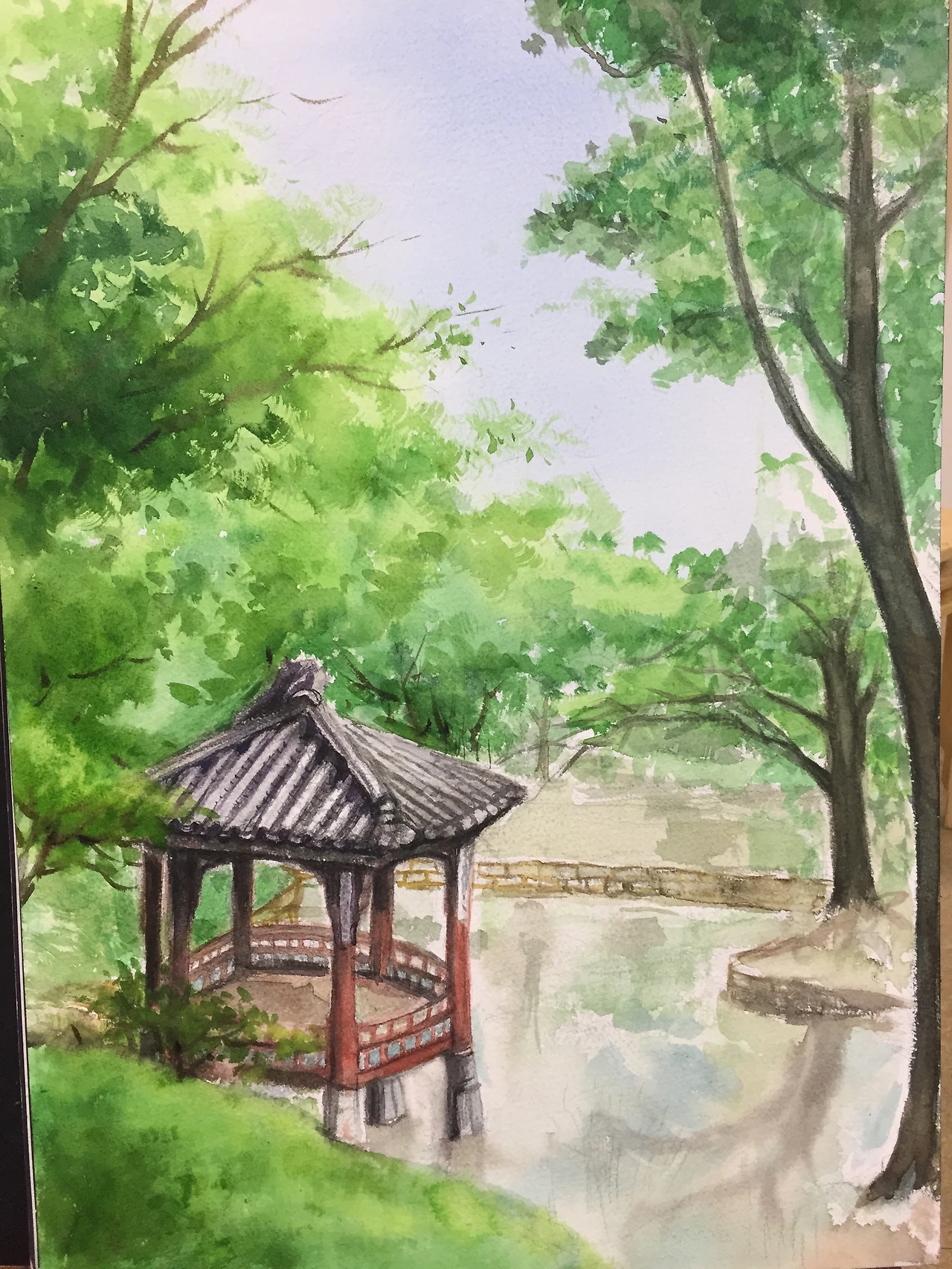 정물화를 몇 개 그리고 나서 풍경화에 도전해 보고 싶었다. 예전에 여행하면서 찍은 사진들을 꺼내보니 그림의 소재로 적당한 것을 찾을 수가 없다. 핀터레스트와 인터넷 검색을 하다가 창덕궁 후원의 정자 사진을 찾아서 그걸 그리기로 했다. 작년 여름에 비원에 갔던 생각도 나고 , 사생 대회하는 기분을 내 보기로 했다. 연못가에 정자가 있고 오래된 나무가 연못 위로 가지를 뻗어 물 위에 비치는.. 아마도 5월쯤의 풍경 스케치를 시작했다.