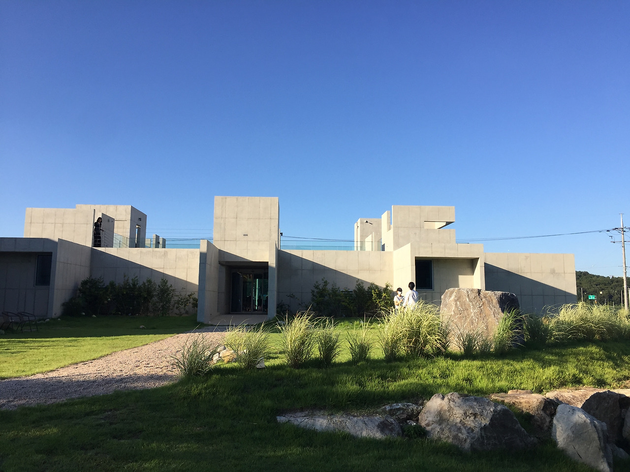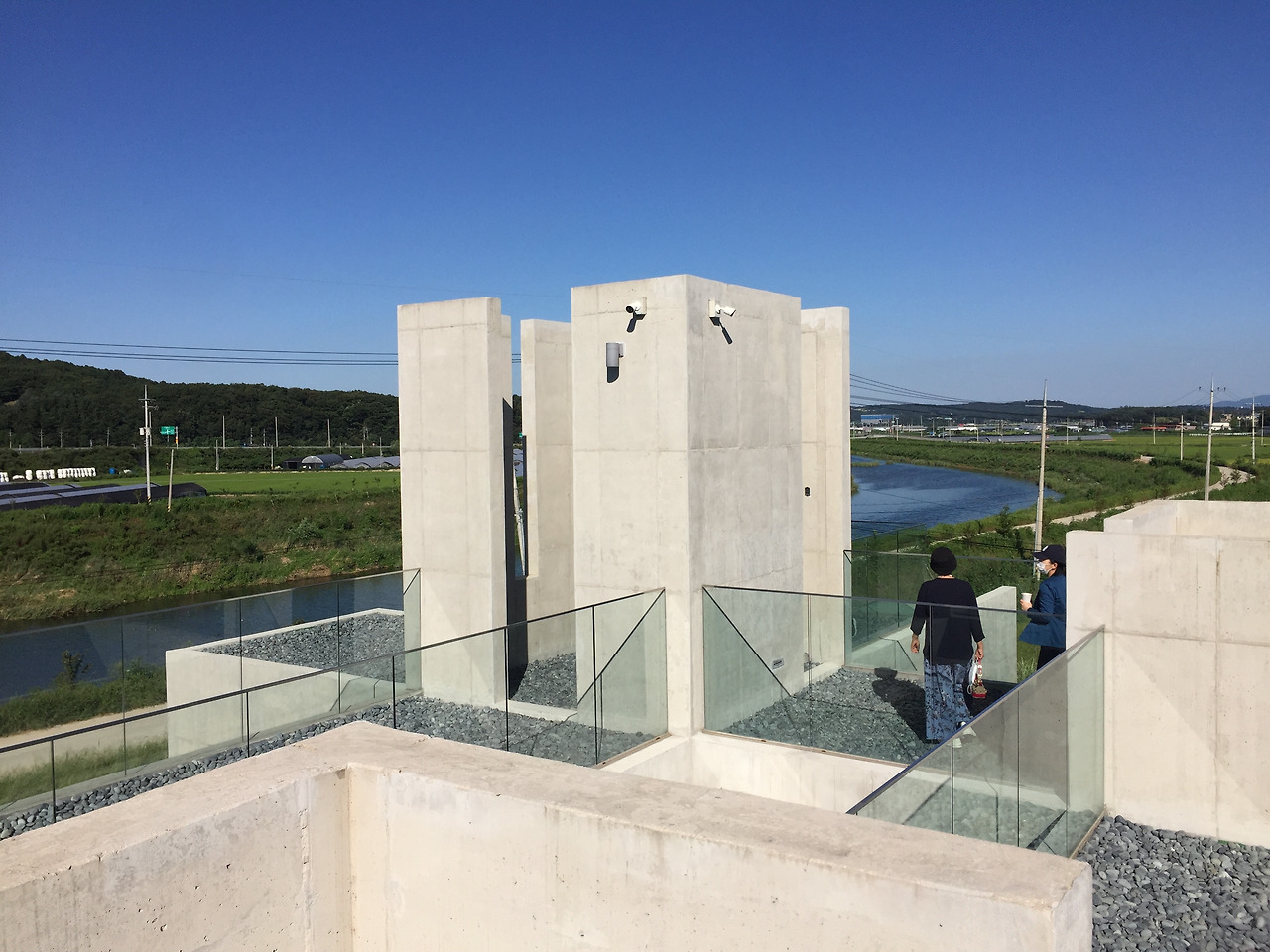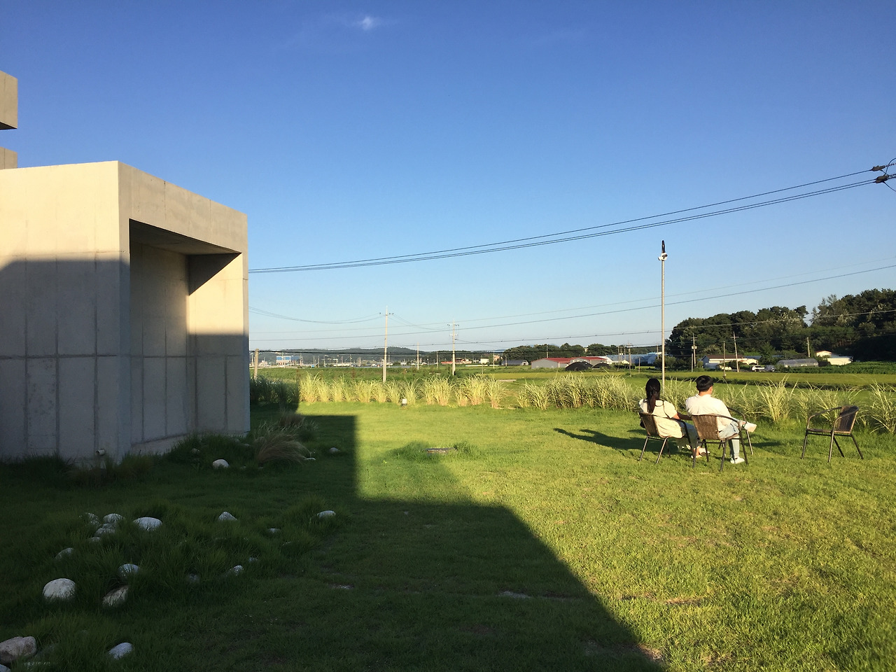 그는 땅의 기억을 짚어 단절된 흔적을 되살리면서 다양한 문화가 교차할 수 있는 건축 공간을 구상했다. 단절됐던 논의 기억을 복원하기 위해 콘크리트 벽을 논길의 수로처럼 세웠다. 가로와 세로의 콘크리트 벽들이 교차하면서 다양한 공간 질서가 만들어졌다. ‘논 스페이스’는 가로와 세로의 질서가 잘 정비된 바둑판 논처럼 확연하다. 남쪽의 낮은 산에서 흘러오는 자연의 흐름이 논, 하천 그리고 반대편 작은 하천의 교차점을 통해 논과 산으로 이어진다. 이것이 다시 논과 산으로 반복되고 그 연장선에 논 스페이스의 벽이 이어지며 세로의 질서를 이룬다. 콘크리트 벽들이 교차하면서 직조된 공간에는 외부의 나무, 돌, 물, 하늘, 자연 등을 들여왔다.