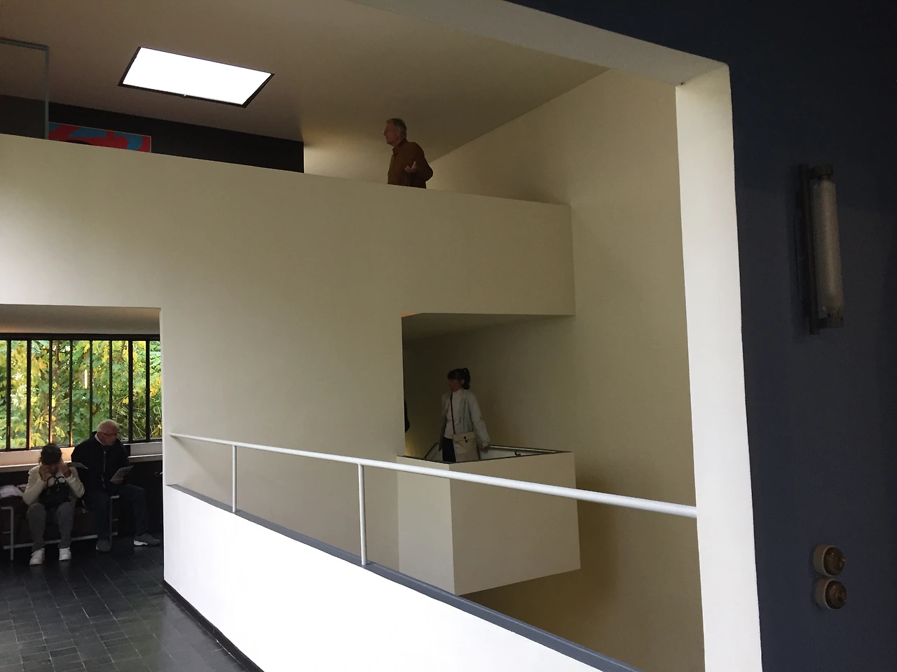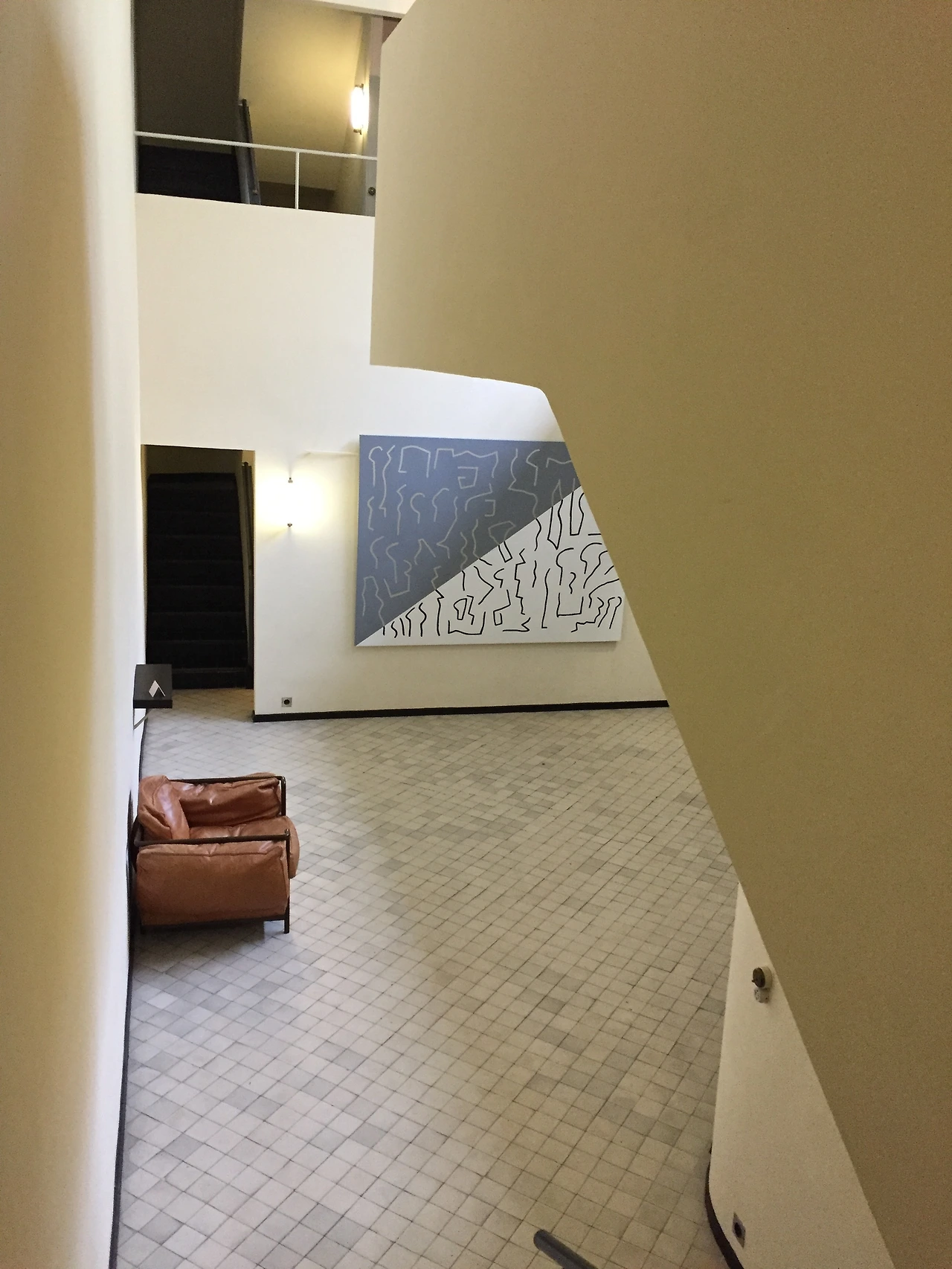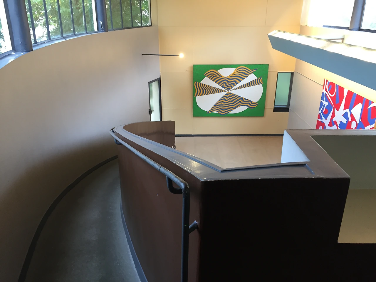 2층의 갤러리에는 남쪽으로 넓은 가로 창이 나 있어 개방감과 함께 자연 채광에서 작품들을 감상할 수 있도록 했다. 북쪽 벽에 붙여서 3층으로 오르는 경사로를 두었다. 건축적 산책로인데 이 경사로를 올라가면서 자신의 소장품을 감상하며 흐뭇한 미소를 지었는 므슈 라로슈를 상상해 본다. 내가 방문했을 때는 이탈리아 화가 카를라 아코르디의 옵티컬아트 작품들을 전시하고 있었다.