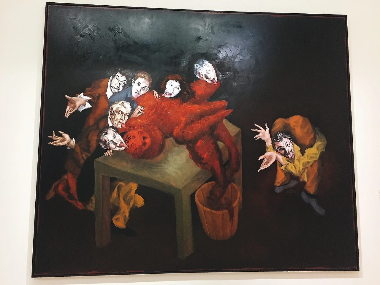그의 적춤을 한마디로 표현하자면 ‘파격’이다. 1960년대 말 파리 에콜 데 보자르에 재학 중 마르셀 뒤샹과 미술비평가이자 미술사학자인 피에르 카반느와의 대담( '마르셀 뒤샹'이란 제목으로 단행본도 나와있다)을 읽고 나서 큰 충격을 받고 회화의 고정된 영역을 벗어나 도전해 보겠다는 생각을 하게 된다. 그는 푸생, 엘 그레코, 틴토레토 등 루브르 박물관에 걸린 거장들의 작품을 관찰하면서 그들의 작풍을 연구하면서 그 위에 자신이 만든 신화(허구적 스토리)를 덧입히는 방식으로 재해석한다. 결과는? 어디서 본 듯한 작품이지만 완전히 다른 분위기의 작품을 만들어 낸다. 기존의 걸작들을 뒤틀고 자신이 창조한 상황을 덧대어 매우 그로테스크한 작품을 만들어 낸다. 그는 거대한 캔버스 위에 수많은 역사적 작품과 인물들을 인상적으로 재해석해 낸다. 구상작품이면서 초현실적인 분위기가 강렬하다. 드라마틱한 설정으로 마치 작품 속 인물들이 다시 연극 무대에 올려진 것 같다.