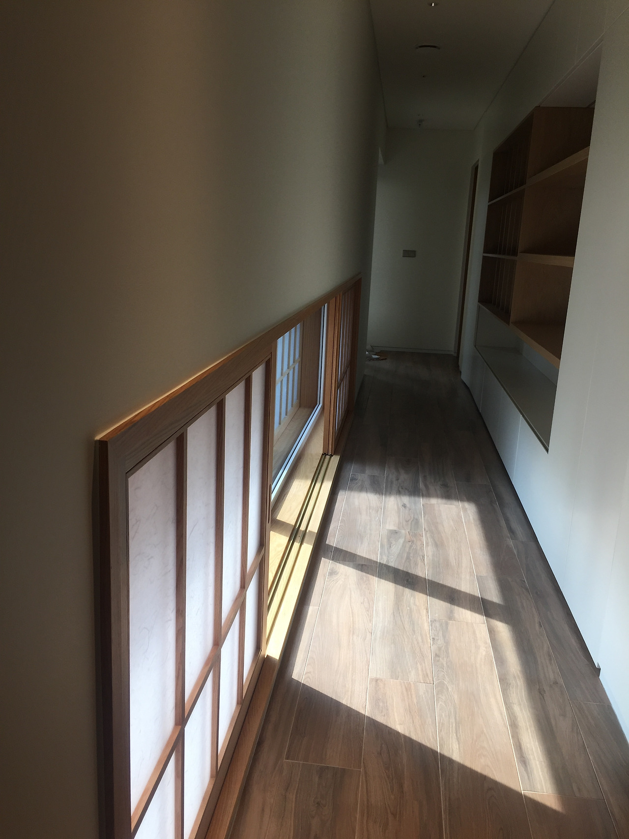 회랑으로 만들어진 긴 복도는 가족의 이야기를 담은 갤러리가 될 것이다. 중정 쪽으로 한지 창호의 효과를 낸 미닫이 문을 아래쪽에 배치해 은은한 빛이 들어오도록 했다. 창문을 열면 부엌에서 일을 하면서도 사계절이 변화하는 정원의 모습을 볼 수 있다.
