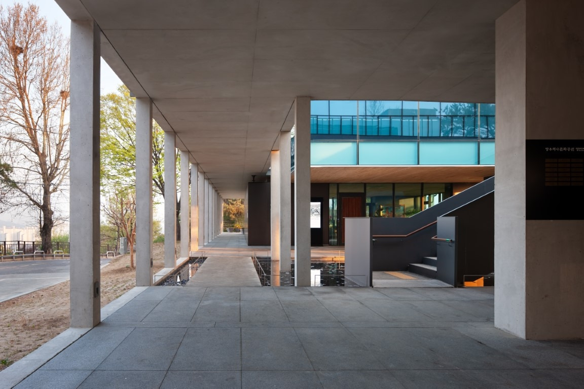 길을 건너 건물에 들어선다. 더 정확하게 표현하자면 회랑 사이로 들어간다. 원래 이곳이 추모공원인 것을 잊지 않으려는 듯 무채색의 회랑은 경쾌한 동시에 그리스 신전의 회랑처럼 경건한 분위기를 연출해 낸다. 회랑 기둥의 그림자가 차폐벽에 어른 거리면서 공간의 표정으로 드러난다. 잔잔하게 물이 담긴 수반에 하늘이 비친다. 주건물의 1층은 카페 등 휴식공간이다. 건물 뒤편으로 우거진 숲과 고요하게 늘어선 회랑이 절묘한 조화를 이뤄 경건함을 더한다. 여름엔 그늘진 야외 공간이 휴식의 장소로 유용하게 쓰일 것 같다.