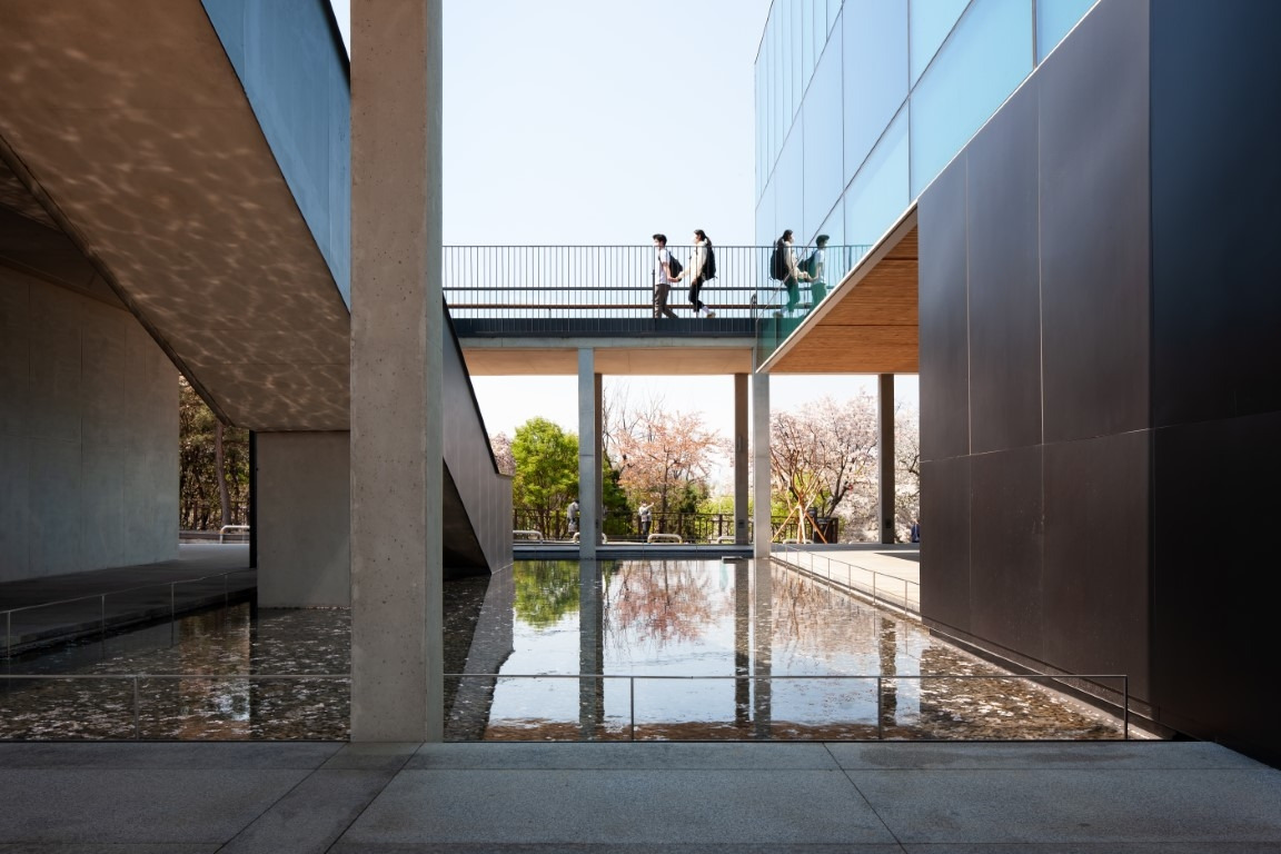 좁고 긴 직선적인 건축물이 어떻게 능선을 타고 도로의 경사면에 들어섰는지를 알아보기 위해서 길을 건넜다. 그런데 길을 건너 바라봐도 건물의 입면이라고 할 만한 것은 잘 보이지 않는다. 정 교수는 “이 건물은 존재감이 없고 풍경이 건물의 입면을 구성한다”고 말했다. 그 말을 듣고 보니 건물이지만 입면이랄 것이 뚜렷하게 드러나지 않고 복도와 회랑이 건물의 이미지를 구축하고 있다. 회랑 사이, 계단실과 수 공간 사이로는 그저 비어있다. 비어있는 공간을 통해 보이는 것은 자연 풍경이다. 주변의 경관을 건물 안으로 끌어들여 자연의 정취를 만끽하는 전통적인 조경기법처럼 기둥 사이로 풍경을 담았다. 기둥 사이에 자연을 그대로 들여놓은 것을 정 교수는 “풍경을 프레임해 준다”고 표현했다. 건물은 막힘이 없고 자연과 사람은 그 사이를 넘나 든다. 의도적으로 건물을 지은 것이 아니라 자연 속에 건물이 들어서 건물 스스로 자연이 된다.