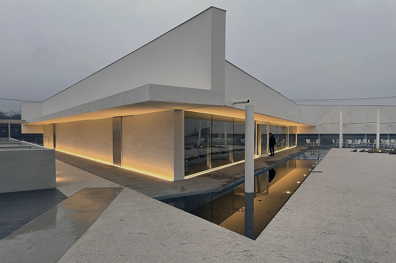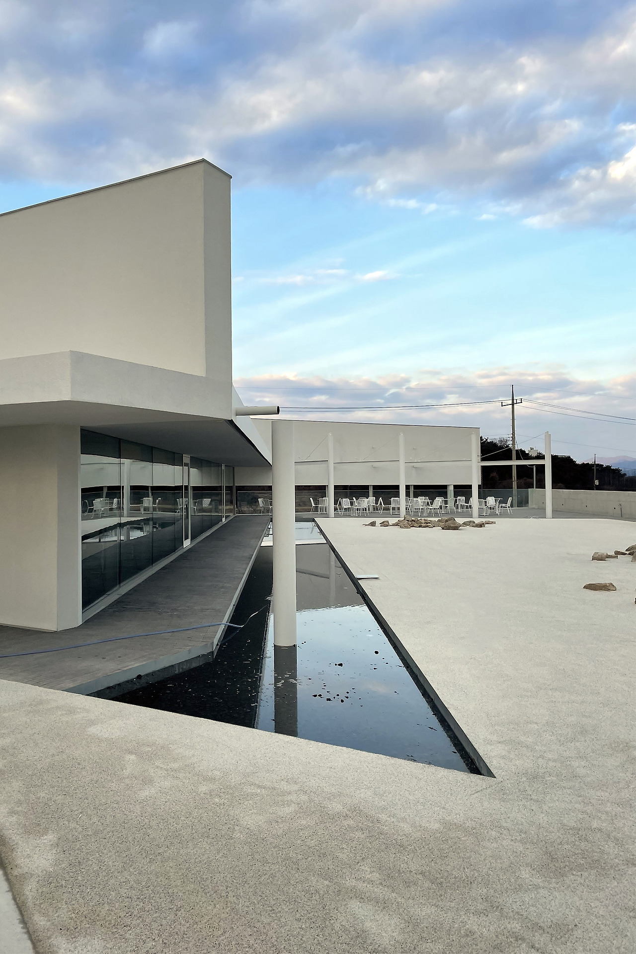필로티 구조의 1층에 주차를 하고 오른쪽에 있는 계단을 오르면 20m 길이의 매달린 경사로를 만난다. 계단과 경사로가 만들어 내는 지그재그의 기하학적인 산책로를 지나 2층으로 올라가면 이국적인 풍경이 펼쳐진다. 백색이 주조를 이루며 마치 무균질의 공간에 온 것 같다. 온길을 돌아보면 경사로도, 난간도, 벽도 모두가 백색 톤이다. 나무 한 그루 심지 않은 채 자연석만 몇 덩어리 무심한 듯이 놓여있는 하얀 모래로 된 정원과 차분하게 하늘이 반사되는 수(水) 공간을 배경으로 카페 건물이 서 있다. 가볍고 경쾌한 철제 T 바를 기둥으로 삼고 나머지를 유리로 처리한 건물은 투명성을 극대화하면서 안과 밖의 경계를 사라지게 만들었다. 삼각형의 한 변인데 처음 간 사람은 입구를 찾기가 힘들다. 민소장은 “삼각형의 단순한 형태여서 입구를 일부러 세 군데로 분산해 이용객들의 내부 동선을 자유롭게 하도록 유도했다”고 설명했다.