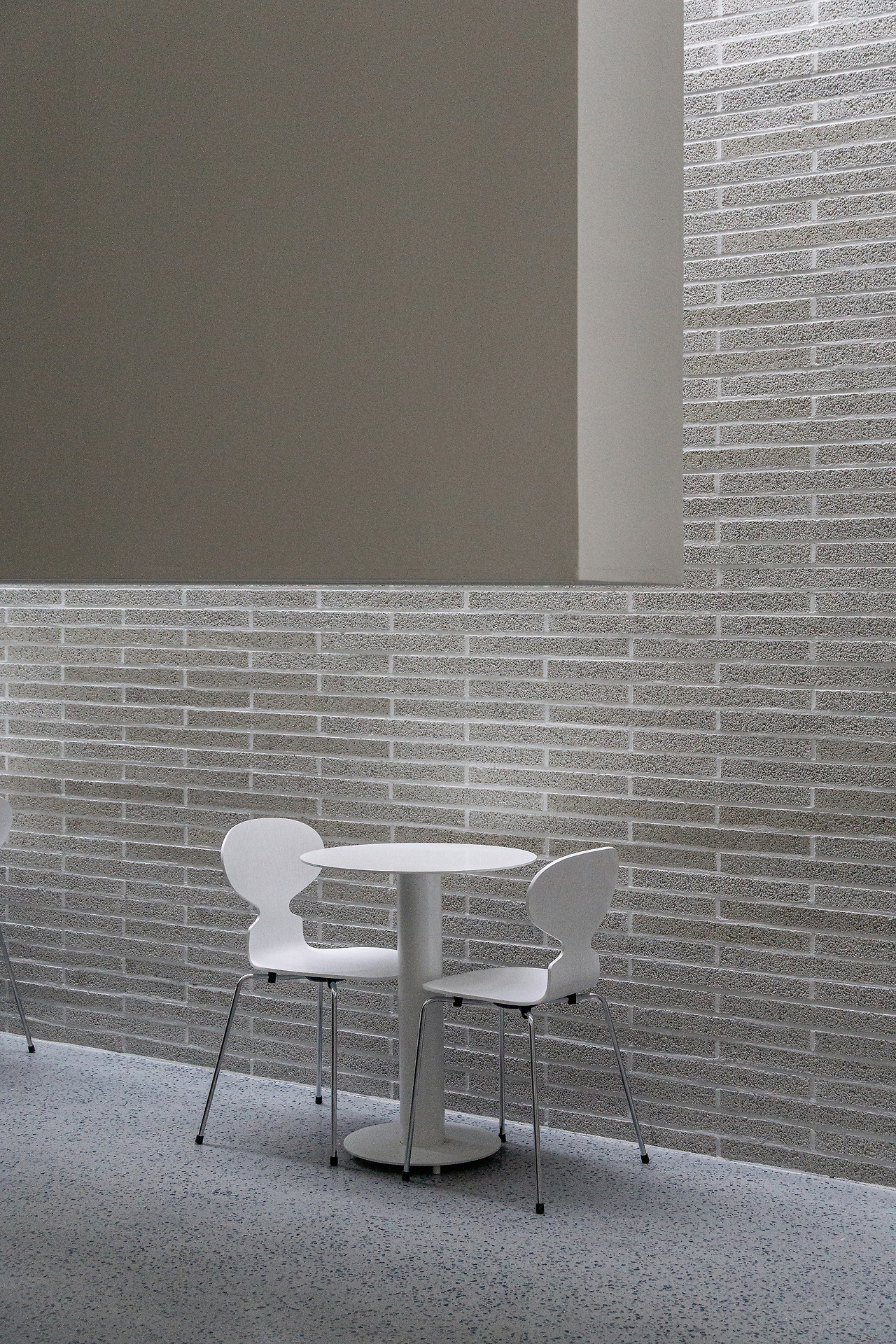 이전에 민 소장이 주택과 공장 설계를 하면서 인연을 맺는 건축주의 오빠는 벽돌공장 사장이다. 덕분에 이 건물에선 벽돌들의 다양한 변주를 볼 수 있다. 내부 벽면의 벽돌은 밝은 베이지색이다. 한 쪽면은 일반 시멘트 벽돌을 사용하고, 바닥에도 같은 벽돌을 깔았고 주방창고 뒤쪽의 벽면은 흡음 벽돌을 사용해 소리가 울리는 것을 최소화했다. 벽돌의 변화를 통해 단순한 내부의 벽면에 은은한 리듬감을 주었다.