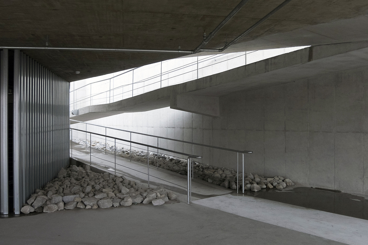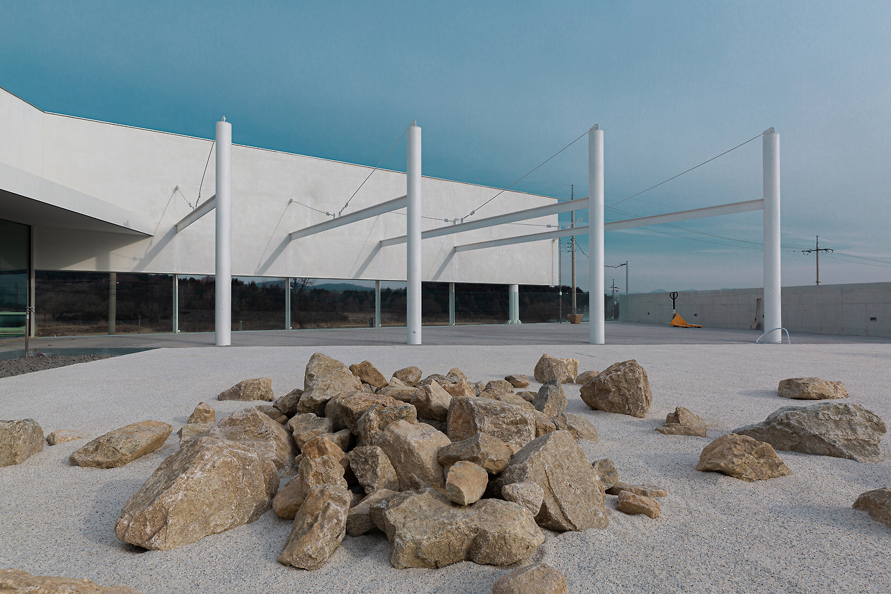밖으로 다시 나가 마당에 섰다. 고속도로 쪽으로 난 벽에는 풍압을 지지하면서 천막을 걸 수 있는 로드 바와 야외 기둥 같은 장식이 보인다. 대담하고 단순한 구조와 형태를 강조하기 위한 장식이자 구조라는 설명이다. 아무런 식재가 없는 사막풍의 조경은 대담하고 단순한 건물과 어우러져 독특한 분위기를 자아낸다. 일본의 료안지 사찰의 모래정원도 떠오른다. 민 소장은 “일본의 사찰 조경을 본딴 것은 아니고 건축주의 한정된 예산을 고려해서 아이디어를 낸 것인데 의외로 반응이 좋아서 이곳을 상징하는 공간이 됐다”고 말했다.