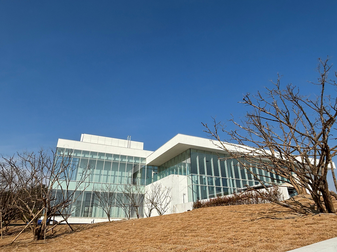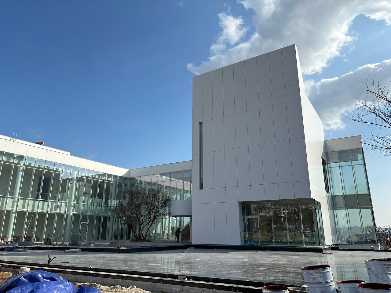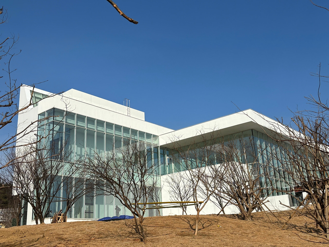 ‘솔올’이라는 이름은 미술관이 자리한 지역의 옛 이름으로, ‘소나무가 많은 고을’이라는 뜻이다. 솔올미술관은 강릉고속버스터미널 맞은편 관동중학교 뒤의 언덕에 자리 잡고 있다. 새롭게 조성되는 공원 부지의 주변에는 강릉원주대학캠퍼스, 평창동계올림픽 당시 선수촌으로 사용됐던 유천선수촌아파트 등이 있고 가까이에는 2024년 11월 입주예정인 롯대캐슬시그니처 아파트가 한창 공사 중이다. ‘솔올미술관’을 목적지로 내비게이션이 안내하는 대로 가면 관동중학교를 오른쪽에 두고 좁은 산길을 따라 올라가게 된다. 현재 주변의 소나무 숲은 거의 그대로이지만 미술관 전체의 조경공사가 진행 중이고 미술관 건물은 완공 단계에 있다. 아래쪽에서 바라본 건축물은 파란 하늘을 배경으로 눈부신 흰색의 존재감을 드러내고 있었다.