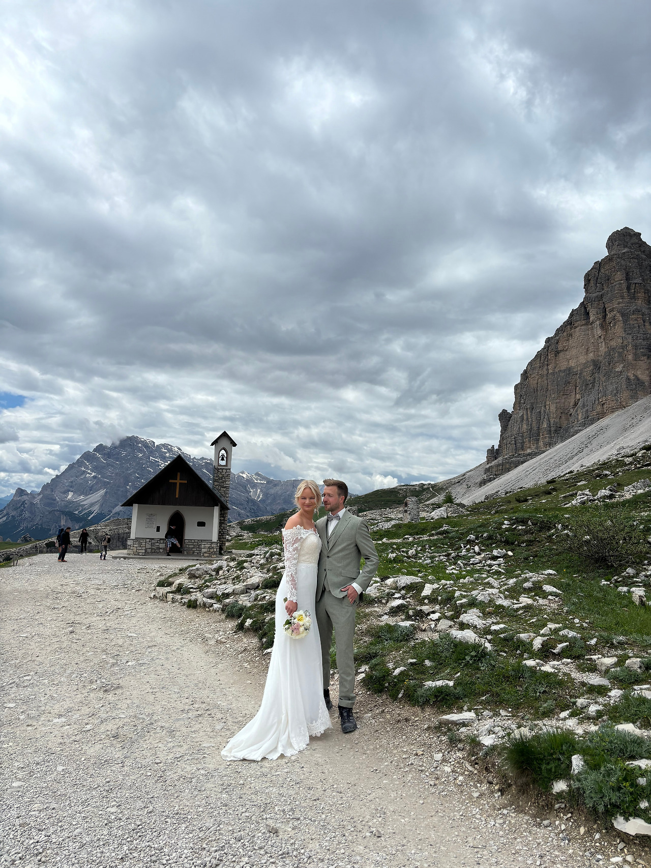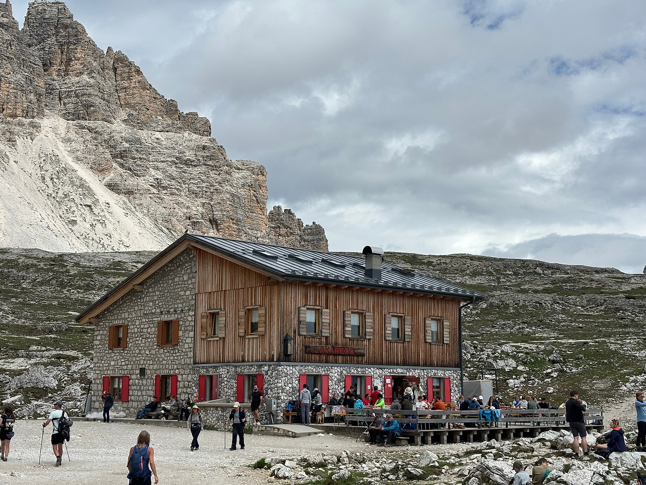 아우론조 산장에서 라바레도 산장(Refugio Lavaredo)까지는 평지를 750m 정도 걷는다. 걷는 중에 발아래로 굽이굽이 계곡들이 펼쳐지는 풍경이 압권이다. 가는 길에 예배당 부근에서 웨딩사진을 찍는 커플도 있었다. 웨딩드레스를 입은 예비신부도, 회색 정장을 차려입은 신랑도 발에는 트레킹화를 신은 것이 재미있었다. 라바레도 산장을 지나면 서서히 오르막에 부서진 돌들이 많은 길이어서 발을 단단히 잡아주는 트레킹화를 신는 것이 좋다.