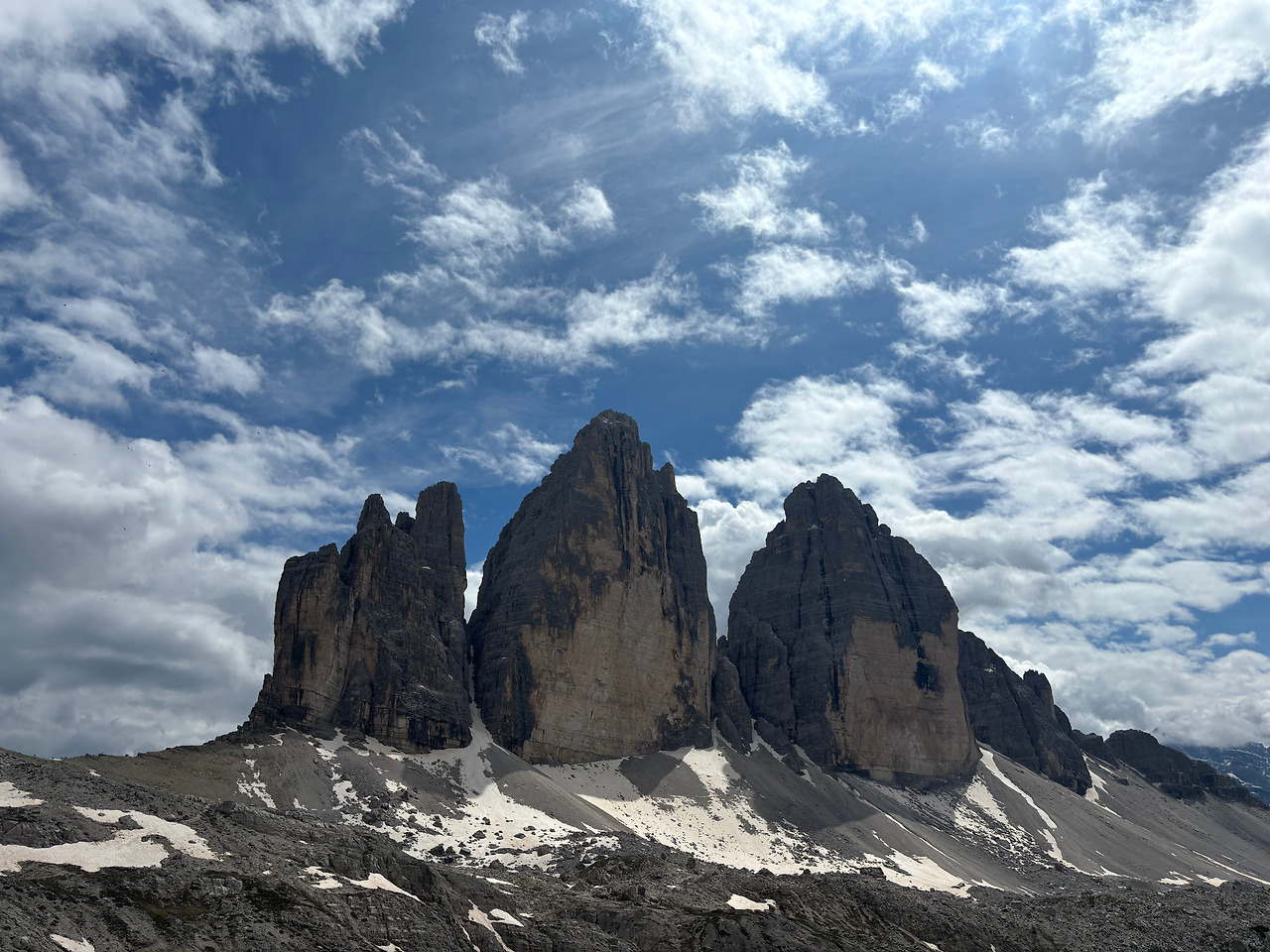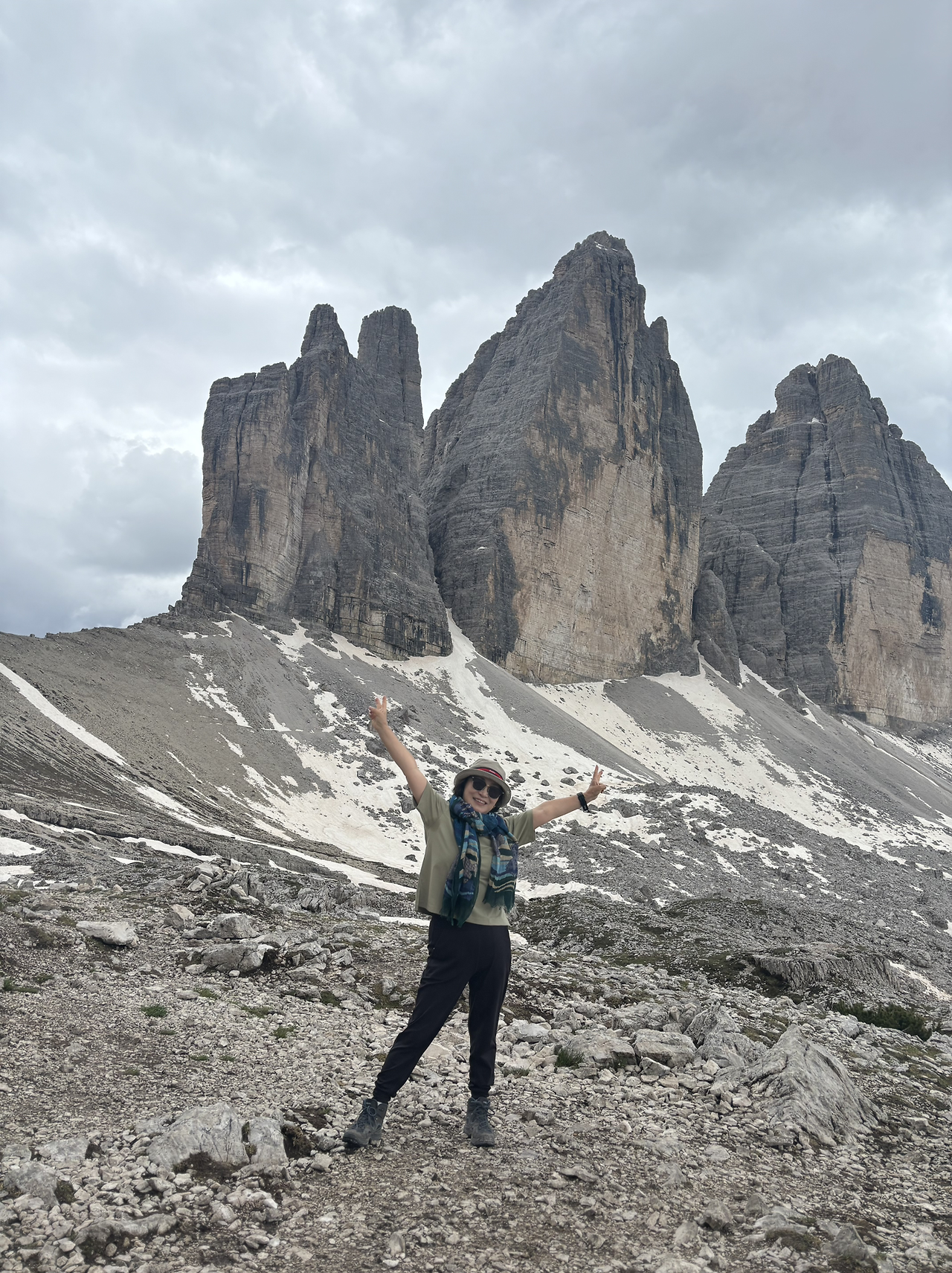 트레치메 가까이 가는 것은 오른쪽으로 길게 돌아가는 길이 있고, 왼쪽으로는 조금 가파르지만 빨리 트레치메를 볼 수 있는 장소에 다다른다. 대부분 가파르고 미끄러운 길을 택한다. 아무 생각 없이 올라가는 게 상책이다. 트레치메의 뒤쪽에서 오른쪽 옆구리를 끼고 올라왔는데 아직까지는 완전한 모습을 볼 수가 없다. 다시 만년설이 남아있는 언덕을 넘어서 이어지는 길을 걸어간다. 드디어 트레치메를 온전히 볼 수 있는 장소에 도착했다. 어찌 저렇게 거인의 창처럼 날카로운 봉우리가 서있을 수 있을까. 주변으로는 깊은 계곡들과 웅장한 산맥의 뾰족한 봉우리들이 끝없이 펼쳐진다. 이런 독특한 풍경은 어떻게 만들어졌을지 신기하다. 10년 전 남미 쿠스코에서 갔던 마추픽추의 풍경도 기이하고 근사했는데 트레치메를 중심으로 한 알프스 산맥의 규모에는 비교할 바가 아니었다.
