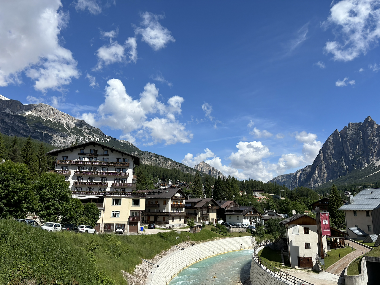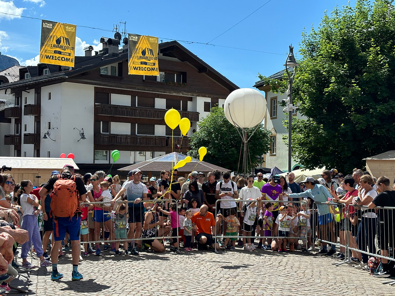 호텔을 나와 다리를 건너면 오른쪽이 바로 코르티나 담페초 시내다. 상점은 모두 문을 열고 있었는데 한 산악용품점에 들어가 보니 요즘 가장 핫 하다는 스위스 스포츠 브랜드 온(On) 운동화가 색깔별로, 디자인별로 디스플레이되어 있었다. 분홍색이 마음에 들어서 신어 보려다가 무거운 짐이 짐스러워 참고 나왔는데 좀 후회된다. 역시 여행 중에는 맘에 드는 것이 있으면 즉시 사는 게 정답이다. 좀 더 시내로 가보니 목요일인데 왁자지껄한 것이 축제 분위기다. 어젯밤에 거리에 깃발들이 걸려 있었는데 코르티나 담페초에서 울트라마라톤 대회의 부대행사로 가족동반 어린이 달리기 대회가 열리고 있었다. 동네사람들은 모두 나온 것 같았다. 물론 주변 마을에서도 왔겠지만 어디서 이렇게 많은 아이들이 나왔는지 깜짝 놀랐다. 운동복 차림으로 나온 엄마, 아빠와 함께 4~5살 아이들부터 초등학교 저학년까지 아이들이 달리기 준비를 하고 있었다. 건강한 어른들은 어린이들에게 사랑이 넘치는 미소로 응원하고 있었다. 저출산 문제로 아이들 구경하기가 어려운 우리나라에서는 보기 어려운 풍경이었다.