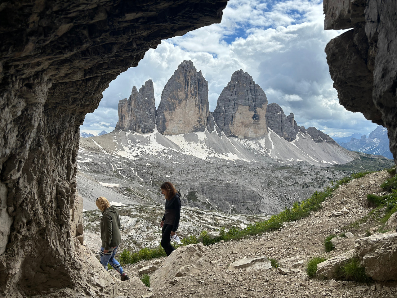 한참 사진을 찍다가 뒤를 돌아보니 다음번 봉우리 방향으로 길이 이어져 있고 걸어가는 사람들도 보인다. 동굴 입구를 통해 트레치메의 세 봉우리가 보이는 곳이 어디냐고 친구에게 물었을 때 “사람들이 가는 쪽으로 가면 된다.”고 했던 게 생각났다. 그러니까 동굴이 있는 또 다른 전망 포인트 포르첼라 라바레도(Forcella Lavaredo)를 가려면 또 다른 산장까지 가서 다시 올라가야 한다. 족히 왕복 1시간이 걸리는 거리였다. 사진을 찍다가 만난 나이 지긋하신 부부(두 달째 유럽 자동차 여행 중이라고 하셨다.)께서는 그곳에서 멈추겠다고 하시지만 나는 계속 가기로 한다. 마지막 길은 정말 가팔랐고 잔 돌이 미끄러져 내려서 올라가기 힘들었다. 그래도 조금씩 힘을 끌어올려 중간 동굴까지 올라갔다. 동굴 속으로 들어가 트레치메를 보니 프레임에 넣어 놓은 것 같은 풍경이다. 젊은 한국인 커플이 개를 데리고 거기까지 올라와 있었다. 상냥하고 붙임성 있는 여자가 혼자 올라온 나를 위해 멋진 사진을 찍어 주고 동영상까지 찍어 주었다. 덕분에 귀중한 사진을 얻었다. (역시 젊은 이들이 사진 찍는 감이 있다.)