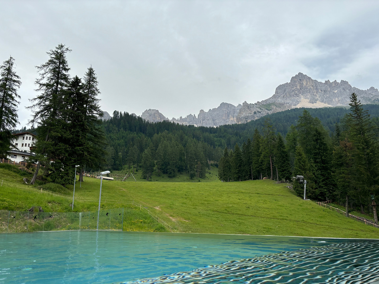 돌로미티의 마지막날 숙소는 카레짜 호수와 볼차노에서 가까운 오베레겐(Obereggen)이라는 곳에 위치한 ‘스포츠호텔 오베레겐’으로 정했다. 스키장과 가까운 지역에는 ‘스포츠호텔’이라고 이름 지은 곳들이 종종 있는데 이곳도 바로 스키장 슬로프 아래에 위치해 있어 객실 발코니에서 슬로프가 바로 보였다. 겨울에 스키를 타기에 아주 이상적인 위치다. 여름이라 풀들이 파랗게 덮인 슬로프에는 소들을 방목하고 있었다. 내부 시설을 보면 체력 단련장은 기본이고 실내 수영장, 실외 인피니티풀, 그리고 사우나가 잘 갖춰져 있는데 사우나는 인티니티 풀과 함께 ‘성인 전용’이라고 표시가 되어 있었다. 객실 키가 있어야 입장이 가능한 ‘자연주의’ 사우나였다.