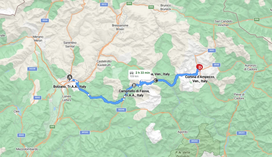 110㎞ 길이의 그레이트 돌로미티 로드에서는 돌로미티 지역의 중요한 봉우리 대부분을 볼 수 있기 때문에 시간이 허락한다면 자동차를 타고 가다 파노라마 감상포인트나 주차장에 멈춰 서서 경치를 감상하고 짧은 산책을 하면서 산세의 화려함을 즐기는 것도 좋다. 물론 일부 구간은 도로가 아주 좁고 헤어핀처럼 급하게 굽은 구간도 많고, 오토바이가 갑자기 튀어나오기도 해서 조심해서 운전해야 한다.