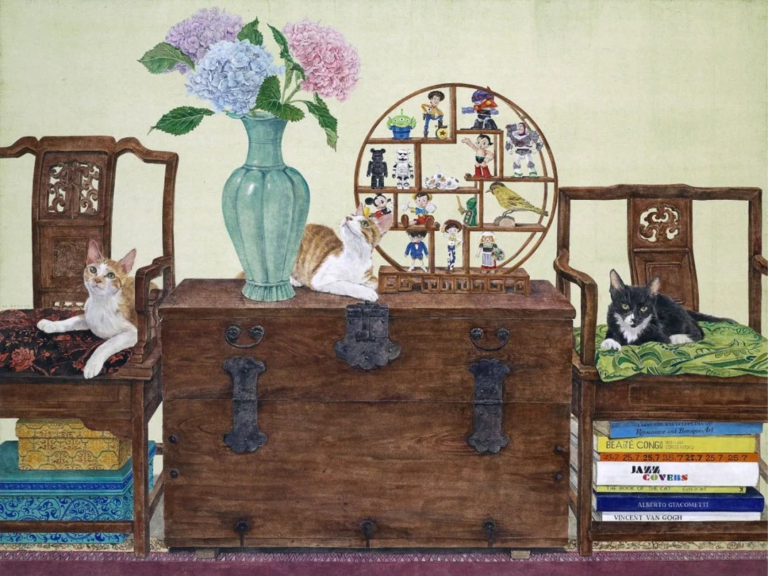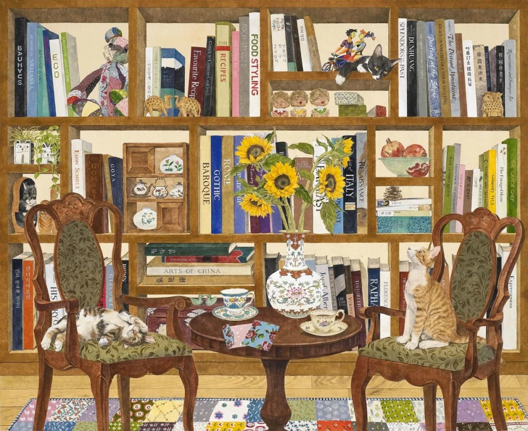 책장에는 다양한 책들이 꽂혀있다. 책 사이로 고양이들이 편안하게 자리 잡고 있고, 앙증맞은 장난감과 장식품도 보인다. 고양이 두 마리가 의자를 차지하고 있는 테이블에 놓인 화병과 찻잔은 평안함을 더한다. 전통적 책가도를 자신만의 현대적 감각으로 그린 책가도 ‘평화로운 서가’의 경우 완성하는데 한 달 이상 걸린 작품이다.