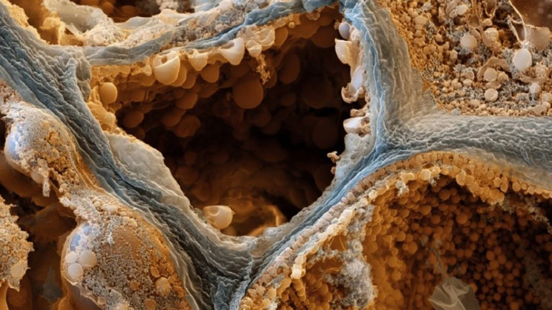 위의 사진은 볶은 커피 속 구조를 전자현미경으로 찍어 얻은 흑백 이미지에 색을 입힌 이미지다. 청회색 부분이 세포벽, 황갈색 부분이 세포벽에 눌어붙은 수용성 고형분, 수용성 고형분 위에 방울방울 붙어있는 것이 커피 오일이다.