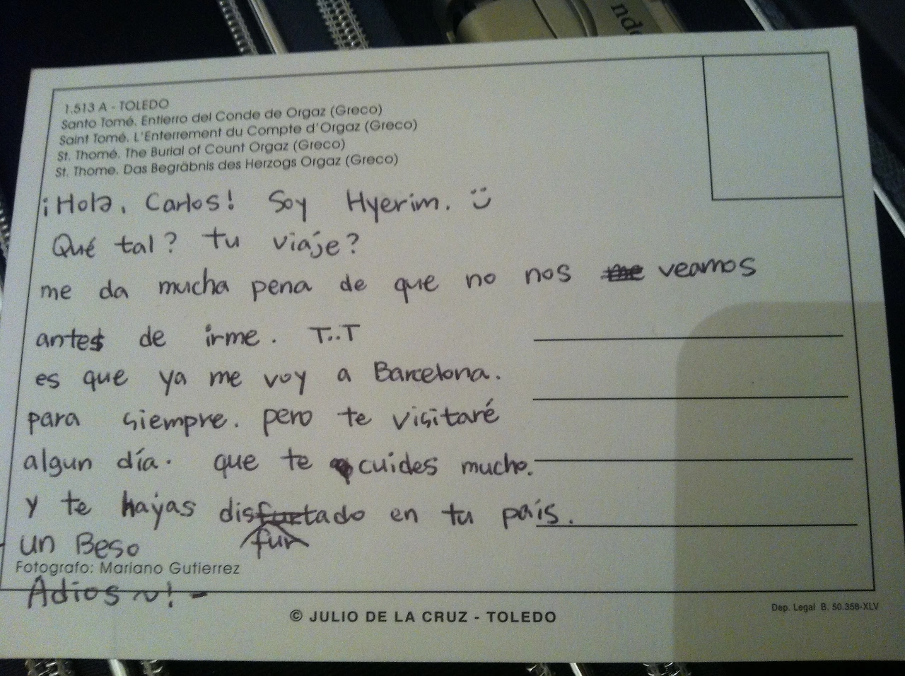 나에게 너무너무 친절했던 경비아저씨 까를로스가 고향 페루로 휴가갔을 때의 일이라 그에게 엽서 한 장을 남기고 난 바르셀로나로 떠나게 됐다.