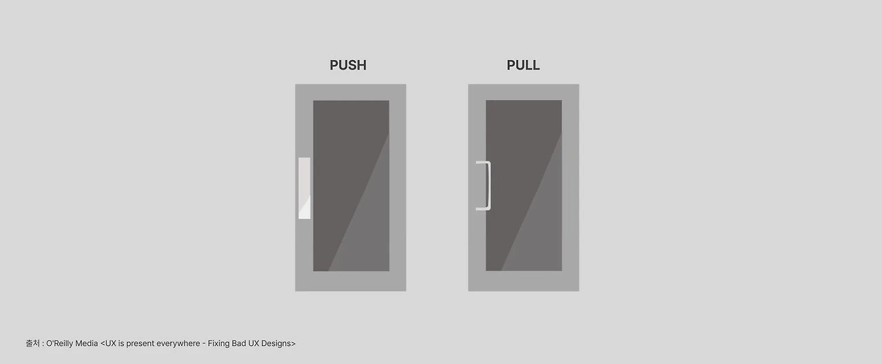 좋은 디자인은 제품 자체만으로 의미를 전달합니다. 별도의 안내문이나 경고문을 부착할 필요가 없다는 뜻입니다. 예를 들어 문에 '당기세요', '미세요', '밀지 마세요'와 같은 스티커를 붙이지 않아도, 손잡이의 형태와 배치만으로 사람들이 자연스럽게 올바른 방향으로 열 수 있도록 돕는 것이 좋은 디자인입니다.